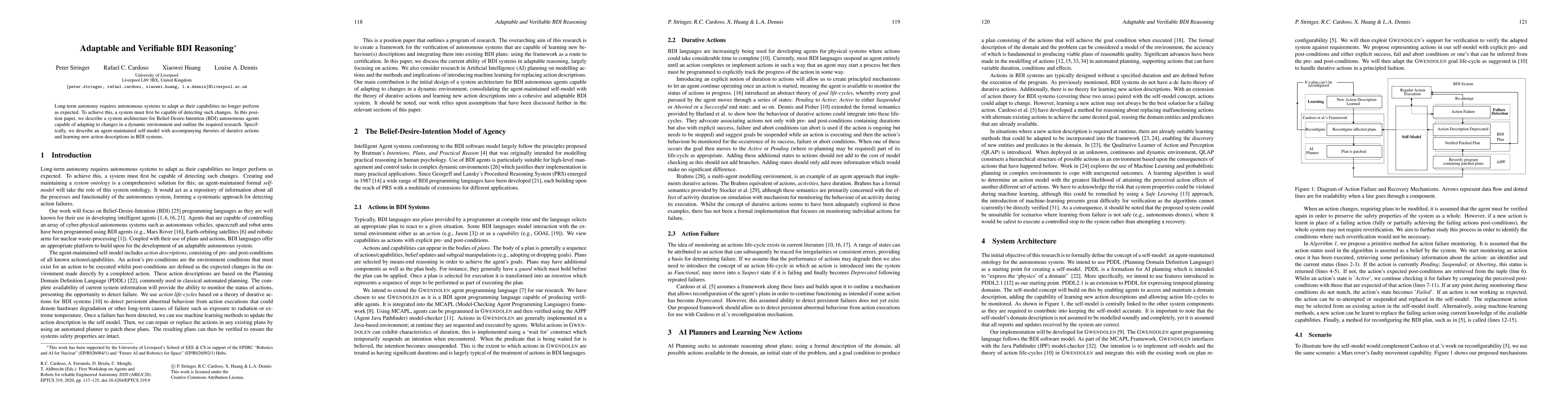 This paper proposes a system architecture for BDI (Belief-Desire-Intention) autonomous agents that can adapt to changes in dynamic environments by maintaining a self-model and incorporating theories of durative actions and learning new action descriptions. The focus is on achieving long-term autonomy through self-detection of capability changes.
