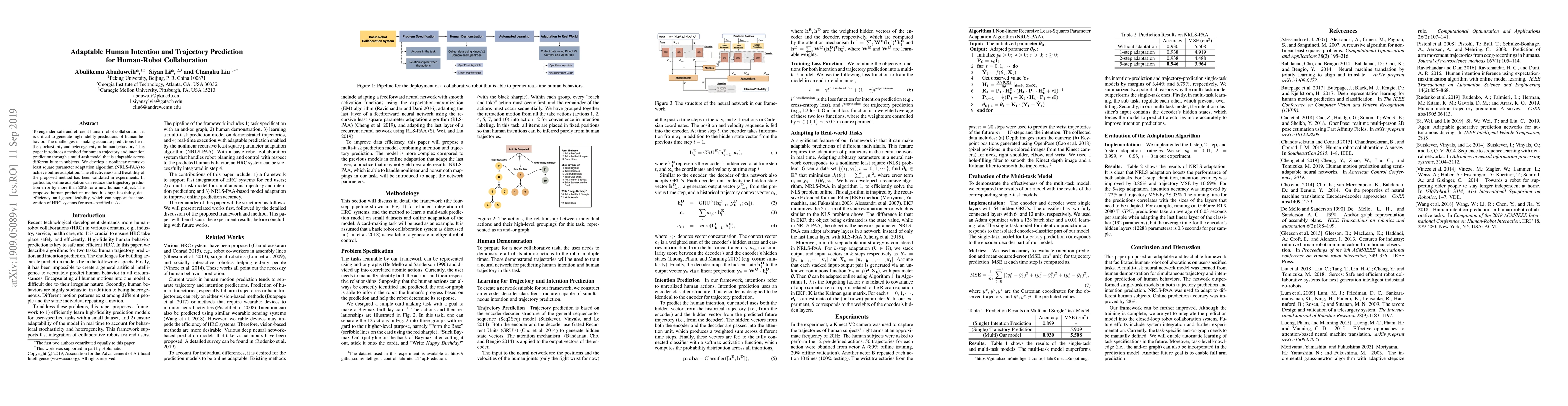 This paper proposes a multi-task model with a nonlinear recursive least square parameter adaptation algorithm (NRLS-PAA) for adaptable human intention and trajectory prediction in human-robot collaboration, achieving over 28% reduction in prediction error for new subjects. The method demonstrates high flexibility, data efficiency, and generalizability.