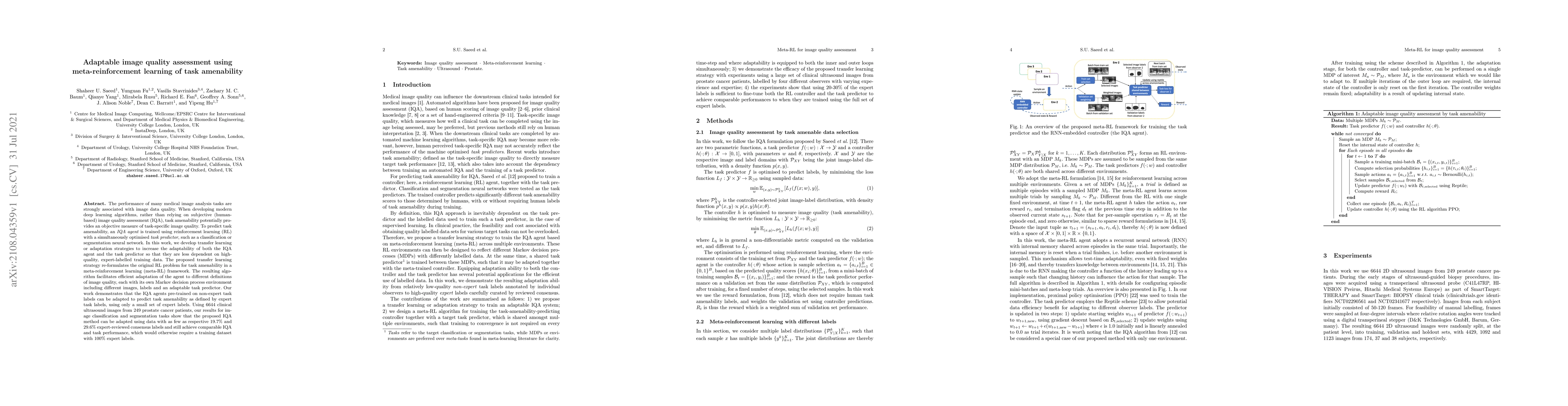 The performance of many medical image analysis tasks are strongly associated with image data quality. When developing modern deep learning algorithms, rather than relying on subjective (human-based) image quality assessment (IQA), task amenability potentially provides an objective measure of task-specific image quality. To predict task amenability, an IQA agent is trained using reinforcement learning (RL) with a simultaneously optimised task predictor, such as a classification or segmentation neural network. In this work, we develop transfer learning or adaptation strategies to increase the adaptability of both the IQA agent and the task predictor so that they are less dependent on high-quality, expert-labelled training data. The proposed transfer learning strategy re-formulates the original RL problem for task amenability in a meta-reinforcement learning (meta-RL) framework. The resulting algorithm facilitates efficient adaptation of the agent to different definitions of image quality, each with its own Markov decision process environment including different images, labels and an adaptable task predictor. Our work demonstrates that the IQA agents pre-trained on non-expert task labels can be adapted to predict task amenability as defined by expert task labels, using only a small set of expert labels. Using 6644 clinical ultrasound images from 249 prostate cancer patients, our results for image classification and segmentation tasks show that the proposed IQA method can be adapted using data with as few as respective 19.7% and 29.6% expert-reviewed consensus labels and still achieve comparable IQA and task performance, which would otherwise require a training dataset with 100% expert labels.