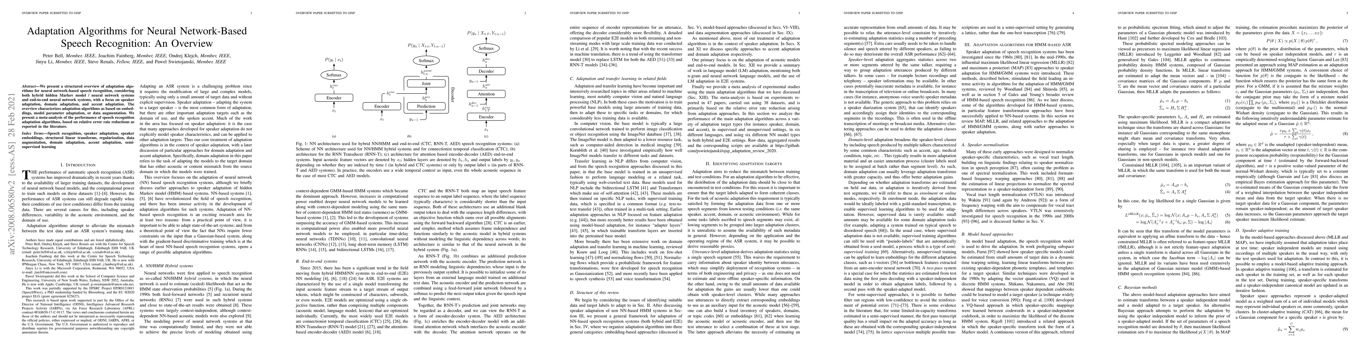 This paper provides a structured overview of adaptation algorithms for neural network-based speech recognition, focusing on speaker, domain, and accent adaptation. It categorizes these algorithms and analyzes their performance based on relative error rate reductions reported in the literature.