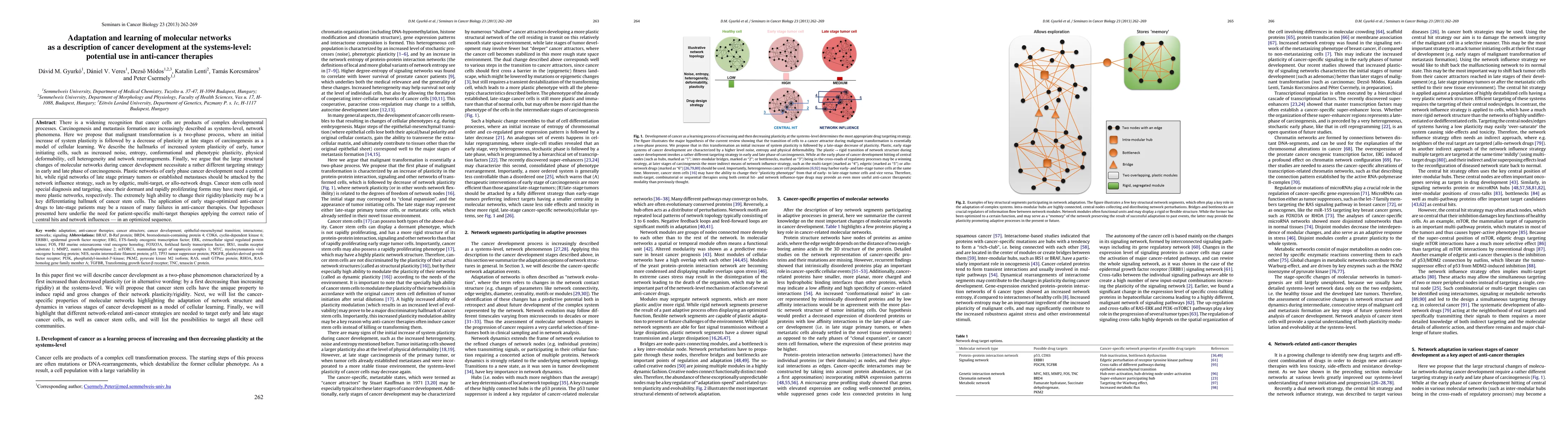 There is a widening recognition that cancer cells are products of complex developmental processes. Carcinogenesis and metastasis formation are increasingly described as systems-level, network phenomena. Here we propose that malignant transformation is a two-phase process, where an initial increase of system plasticity is followed by a decrease of plasticity at late stages of carcinogenesis as a model of cellular learning. We describe the hallmarks of increased system plasticity of early, tumor initiating cells, such as increased noise, entropy, conformational and phenotypic plasticity, physical deformability, cell heterogeneity and network rearrangements. Finally, we argue that the large structural changes of molecular networks during cancer development necessitate a rather different targeting strategy in early and late phase of carcinogenesis. Plastic networks of early phase cancer development need a central hit, while rigid networks of late stage primary tumors or established metastases should be attacked by the network influence strategy, such as by edgetic, multi-target, or allo-network drugs. Cancer stem cells need special diagnosis and targeting, since their dormant and rapidly proliferating forms may have more rigid, or more plastic networks, respectively. The extremely high ability to change their rigidity/plasticity may be a key differentiating hallmark of cancer stem cells. The application of early stage-optimized anti-cancer drugs to late-stage patients may be a reason of many failures in anti-cancer therapies. Our hypotheses presented here underlie the need for patient-specific multi-target therapies applying the correct ratio of central hits and network influences -- in an optimized sequence.