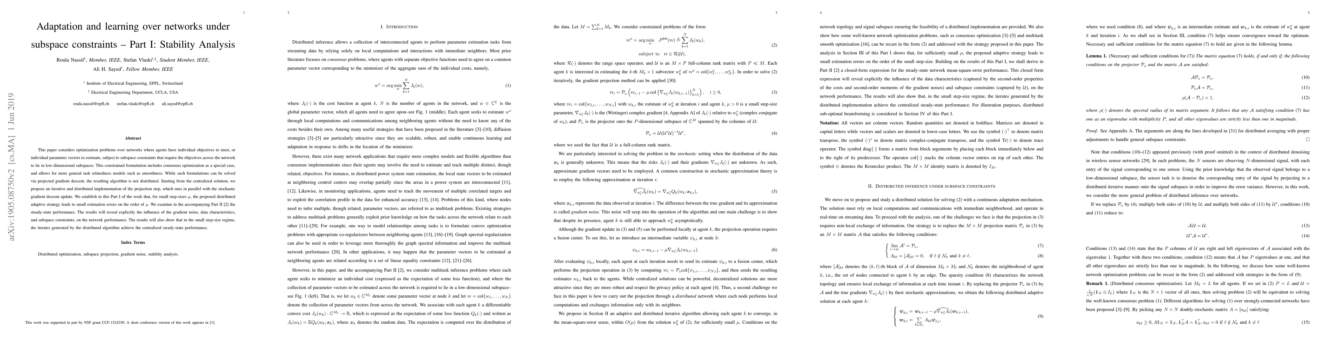 This paper proposes a distributed iterative algorithm for solving optimization problems over networks with subspace constraints, showing stability under small step-sizes. The method achieves centralized performance in the small step-size regime, with subsequent work examining steady-state performance.