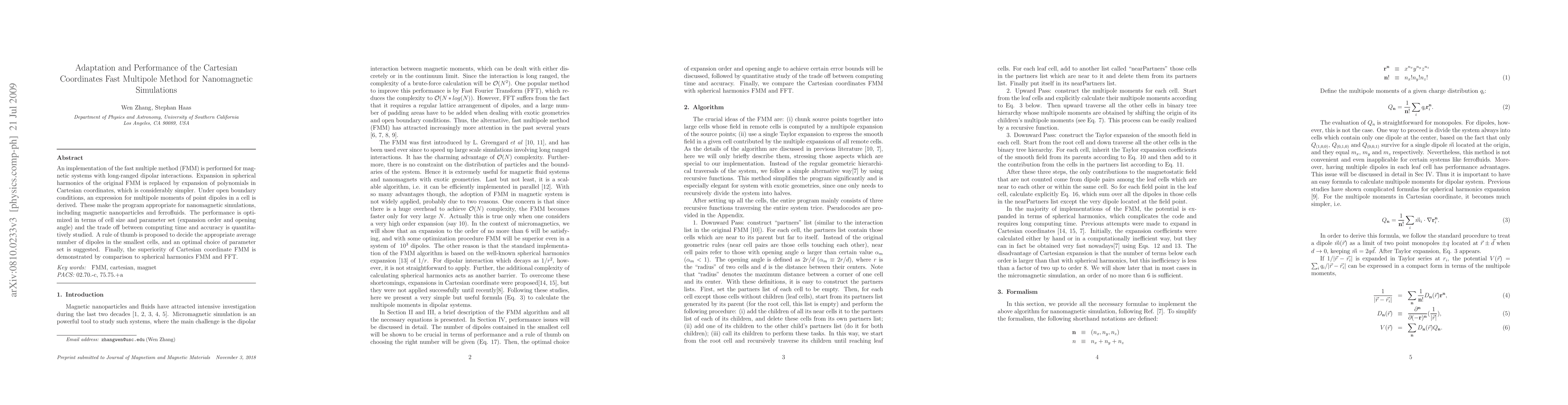 An implementation of the fast multiple method (FMM) is performed for magnetic systems with long-ranged dipolar interactions. Expansion in spherical harmonics of the original FMM is replaced by expansion of polynomials in Cartesian coordinates, which is considerably simpler. Under open boundary conditions, an expression for multipole moments of point dipoles in a cell is derived. These make the program appropriate for nanomagnetic simulations, including magnetic nanoparticles and ferrofluids. The performance is optimized in terms of cell size and parameter set (expansion order and opening angle) and the trade off between computing time and accuracy is quantitatively studied. A rule of thumb is proposed to decide the appropriate average number of dipoles in the smallest cells, and an optimal choice of parameter set is suggested. Finally, the superiority of Cartesian coordinate FMM is demonstrated by comparison to spherical harmonics FMM and FFT.