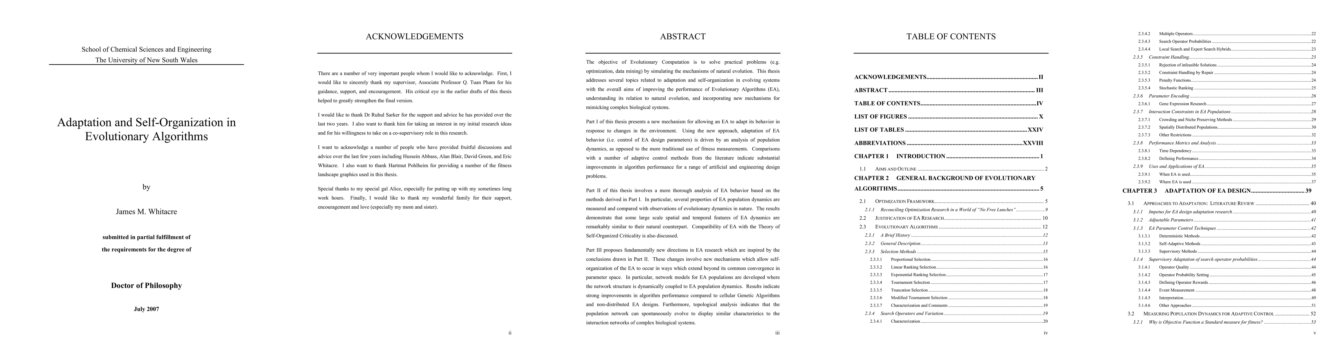 Abbreviated Abstract: The objective of Evolutionary Computation is to solve practical problems (e.g. optimization, data mining) by simulating the mechanisms of natural evolution. This thesis addresses several topics related to adaptation and self-organization in evolving systems with the overall aims of improving the performance of Evolutionary Algorithms (EA), understanding its relation to natural evolution, and incorporating new mechanisms for mimicking complex biological systems.