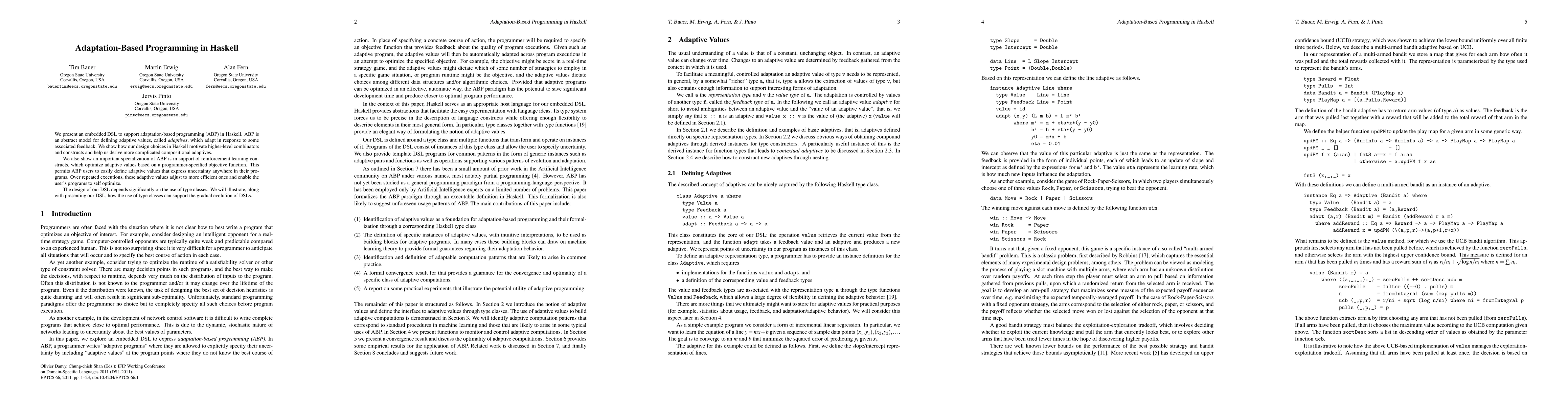 This paper introduces an embedded DSL for adaptation-based programming in Haskell, enabling adaptive values to adjust based on feedback and optimize over time. The design leverages type classes to facilitate gradual evolution of the DSL, with a focus on reinforcement learning constructs for self-optimization.