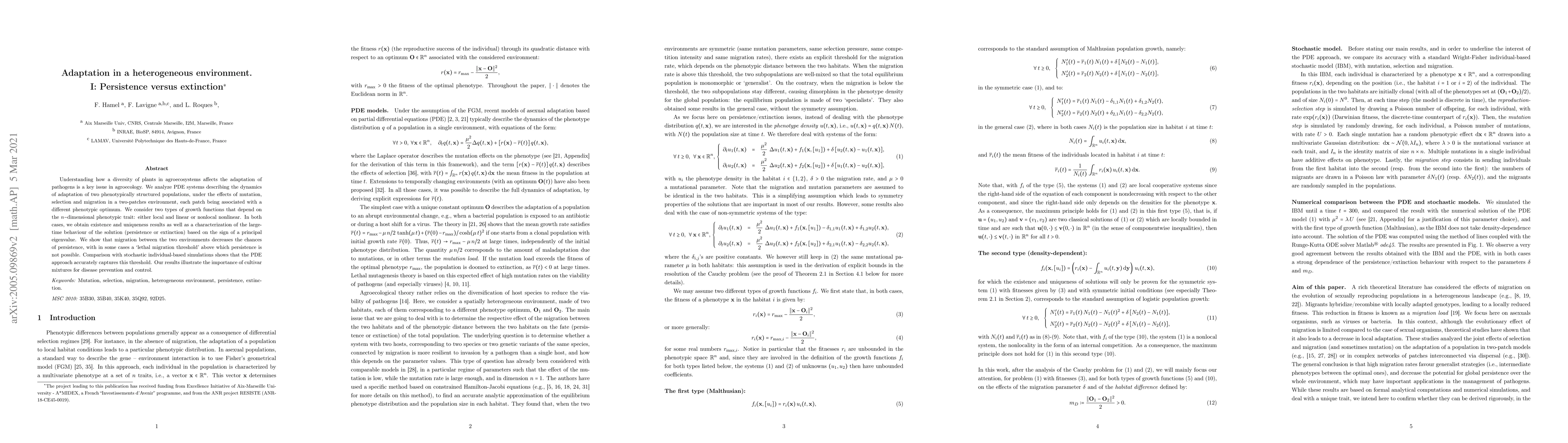 Understanding how a diversity of plants in agroecosystems affects the adaptation of pathogens in a key issue in agroecology. We analyze PDE systems describing the dynamics of adaptation of two phenotypically structured populations, under the effects of mutation, selection and migration in a two-patches environment, each patch being associated with a different phenotypic optimum. We consider two types of growth functions that depend on the n--dimensional phenotypic trait: either local and linear or nonlocal nonlinear. In both cases, we obtain existence and uniqueness results as well as a characterization of the large-time behaviour of the solution (persistence or extinction) based on the sign of a principal eigenvalue. We show that migration between the two environments decreases the chances of persistence, with in some cases a 'lethal migration threshold' above which persistence is not possible. Comparison with stochastic individual-based simulations shows that the PDE approach accurately captures this threshold. Our results illustrate the importance of cultivar mixtures for disease prevention and control.