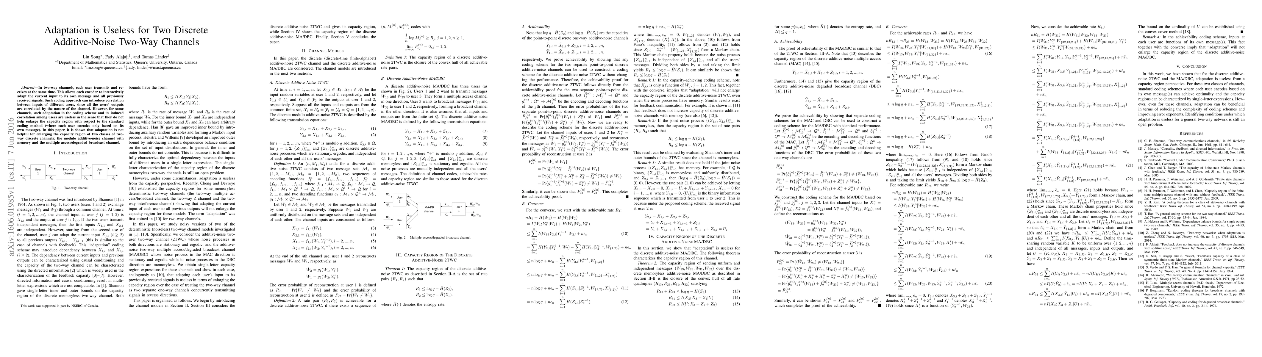 This paper demonstrates that adaptive coding schemes do not enhance the capacity region for two specific types of two-way discrete additive-noise channels: the modulo additive-noise channel with memory and the multiple access/degraded broadcast channel, compared to standard coding methods.