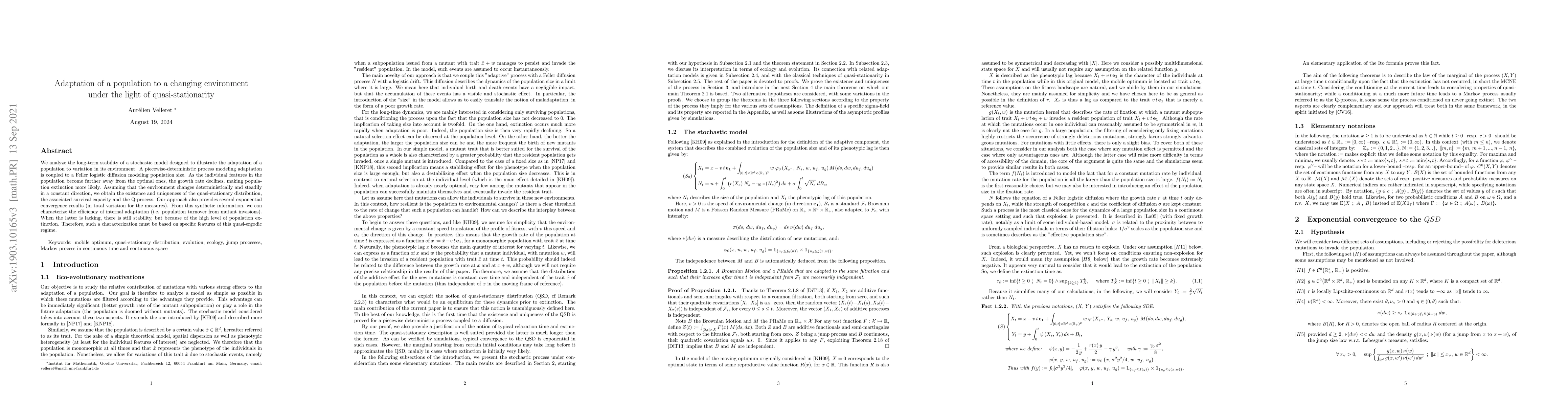 This paper investigates the long-term stability of a stochastic model depicting a population's adaptation to environmental changes through a quasi-stationary distribution. It finds that while adaptation can maintain stability, a lack of efficient adaptation leads to higher extinction rates, highlighting the importance of internal adaptation mechanisms.