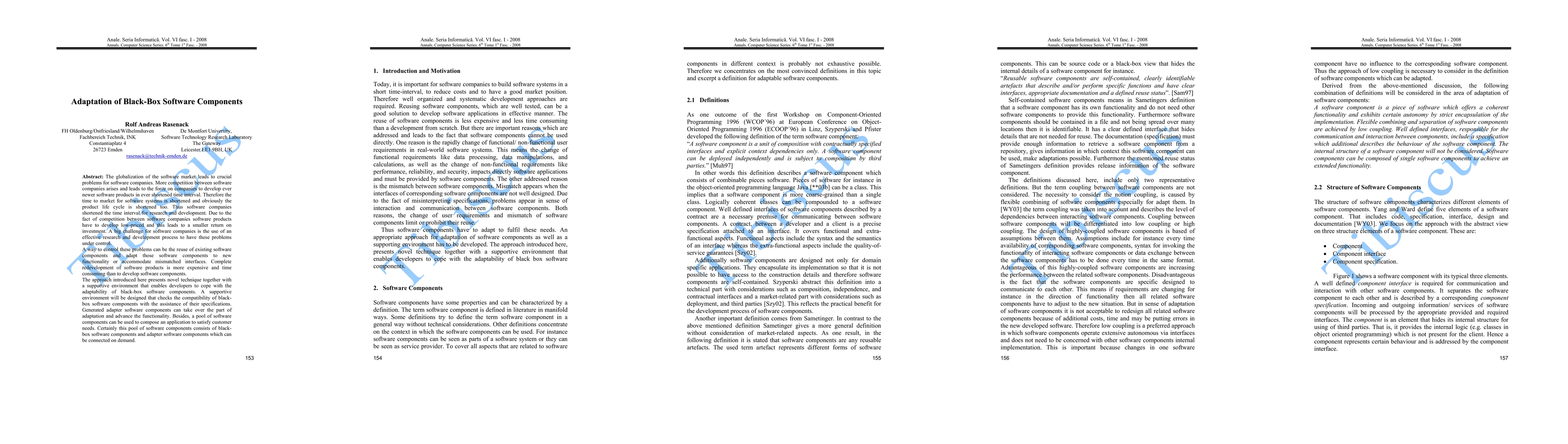 The globalization of the software market leads to crucial problems for software companies. More competition between software companies arises and leads to the force on companies to develop ever newer software products in ever shortened time interval. Therefor the time to market for software systems is shortened and obviously the product life cycle is shortened too[...]The approach introduced here presents the novel technique together with a supportive environment that enables developers to cope with the adaptability of black-box software components. A supported environment will be designed that checks the compatibility of black-box software components with the assistance of their specifications.