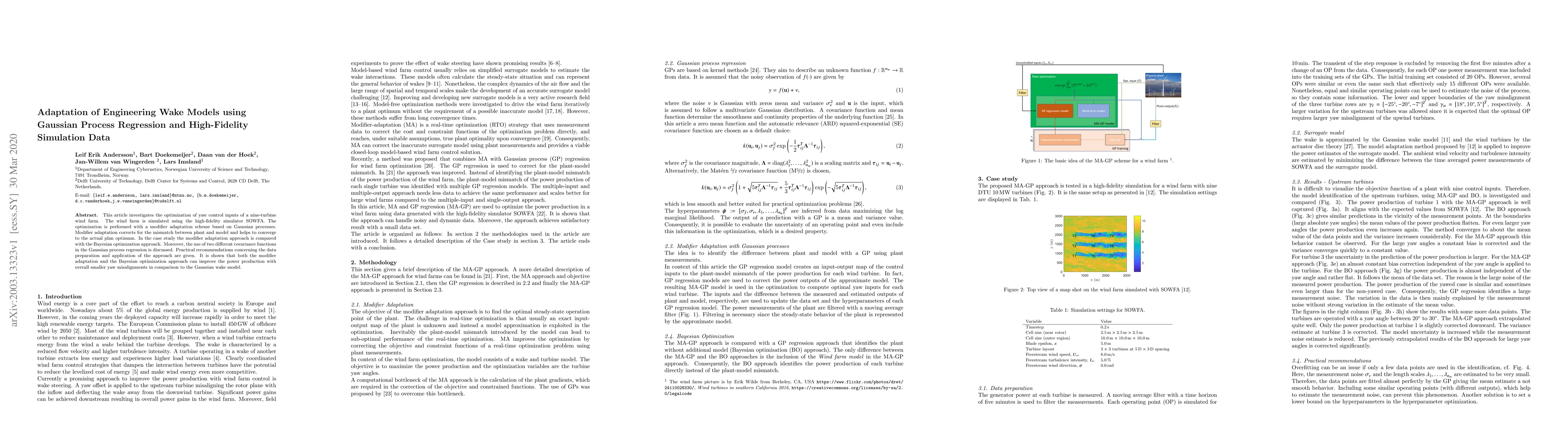 This paper optimizes yaw control inputs for a nine-turbine wind farm using Gaussian process regression and high-fidelity simulation data, demonstrating improved power production and reduced yaw misalignments compared to traditional Gaussian wake models. The study compares modifier adaptation with Bayesian optimization and discusses different covariance functions.