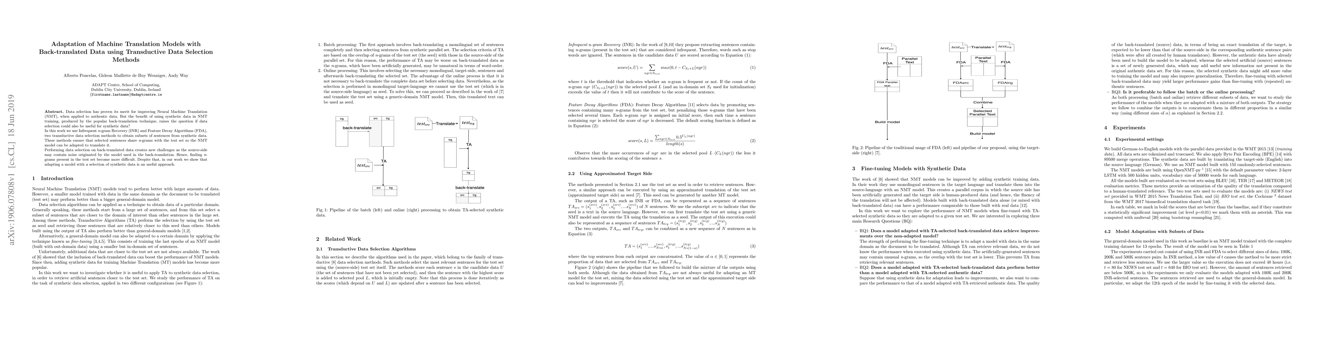 This paper explores the use of transductive data selection methods to improve the adaptation of Neural Machine Translation (NMT) models using back-translated data. By applying Infrequent N-gram Recovery and Feature Decay Algorithms, the study demonstrates that selecting subsets of synthetic data can enhance model performance, despite challenges posed by noise in the back-translated source data.
