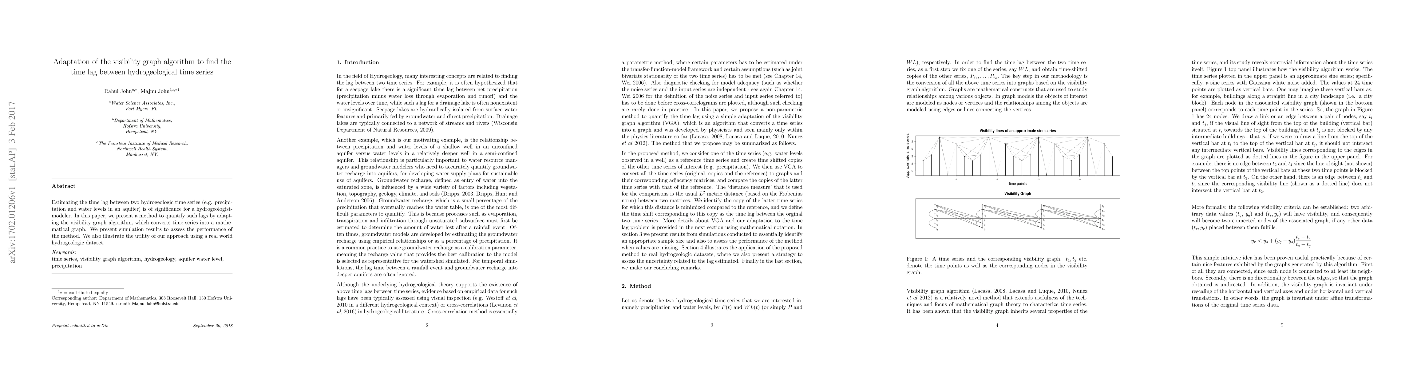 Estimating the time lag between two hydrogeologic time series (e.g. precipitation and water levels in an aquifer) is of significance for a hydrogeologist-modeler. In this paper, we present a method to quantify such lags by adapting the visibility graph algorithm, which converts time series into a mathematical graph. We present simulation results to assess the performance of the method. We also illustrate the utility of our approach using a real world hydrogeologic dataset.