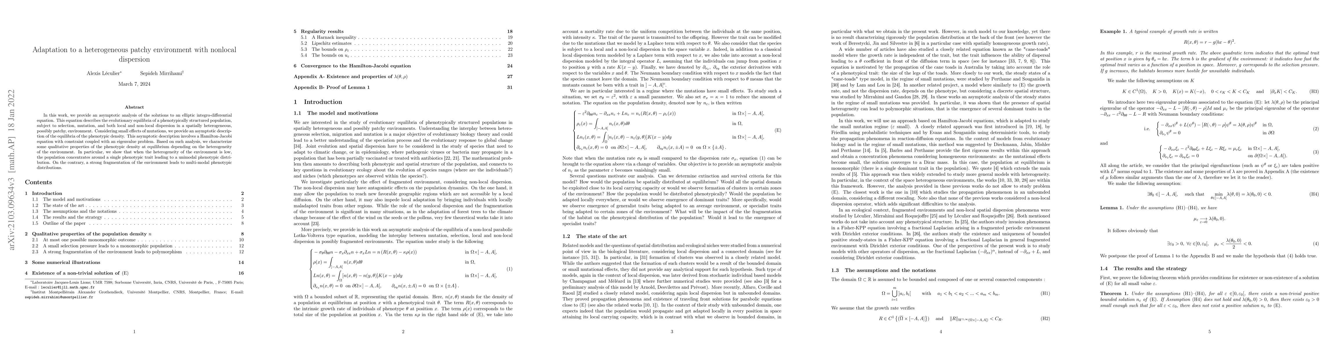 In this work, we provide an asymptotic analysis of the solutions to an elliptic integro-differential equation. This equation describes the evolutionary equilibria of a phenotypically structured population, subject to selection, mutation, and both local and non-local dispersion in a spatially heterogeneous, possibly patchy, environment. Considering small effects of mutations, we provide an asymptotic description of the equilibria of the phenotypic density. This asymptotic description involves a Hamilton-Jacobi equation with constraint coupled with an eigenvalue problem. Based on such analysis, we characterize some qualitative properties of the phenotypic density at equilibrium depending on the heterogeneity of the environment. In particular, we show that when the heterogeneity of the environment is low, the population concentrates around a single phenotypic trait leading to a unimodal phenotypic distribution. On the contrary, a strong fragmentation of the environment leads to multi-modal phenotypic distributions.