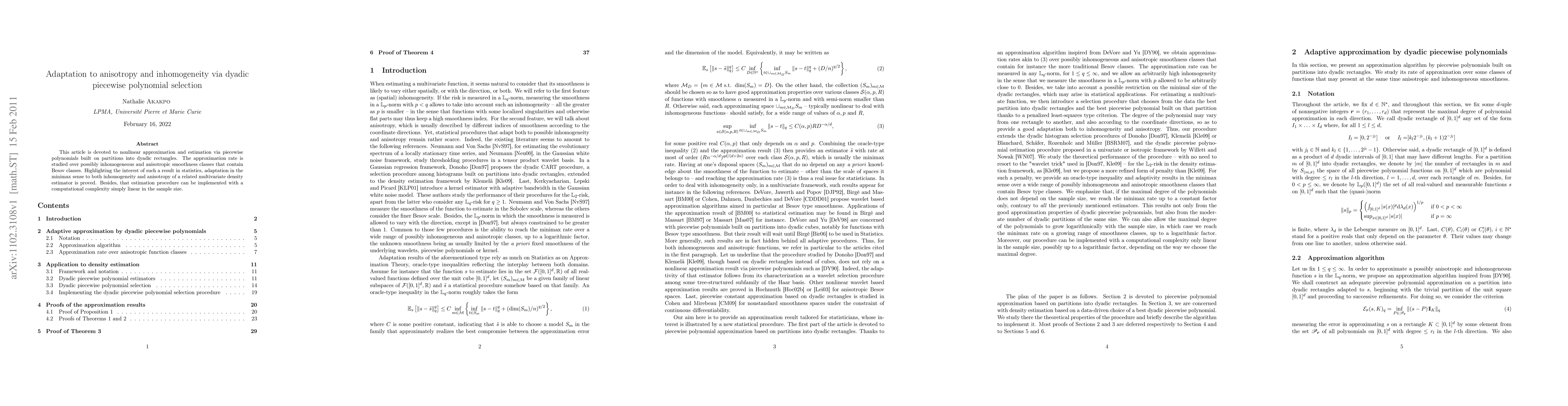 This paper explores nonlinear approximation using dyadic piecewise polynomials, focusing on adaptation to inhomogeneity and anisotropy in Besov classes. It proves minimax adaptation for multivariate density estimation with linear computational complexity.