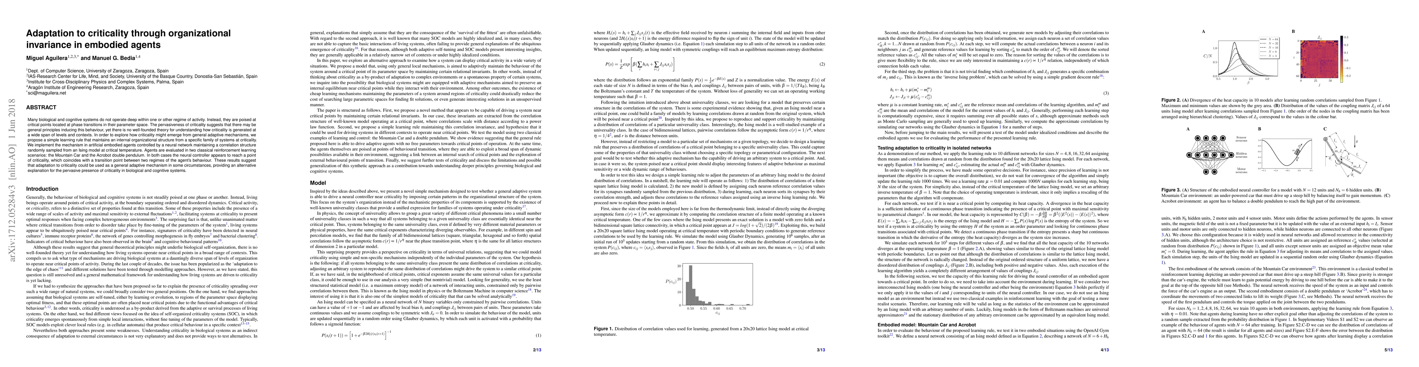 The research proposes a simple learning rule that maintains an internal organizational structure from a specific family of systems at criticality, implemented in artificial embodied agents controlled by a neural network. The neural controller's correlation structure is randomly sampled from an Ising model at critical temperature, evaluated in Mountain Car and Acrobot reinforcement learning scenarios.