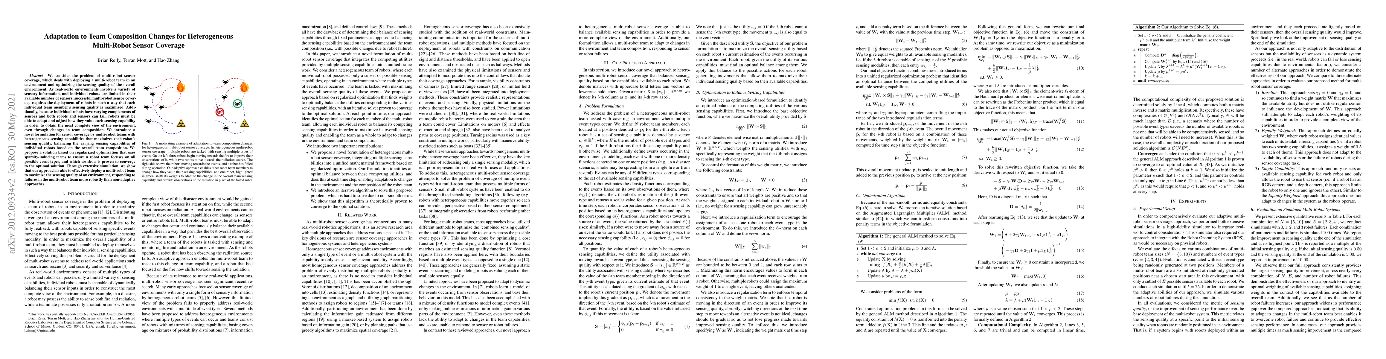 This paper proposes a novel optimization approach to maximize multi-robot sensor coverage in dynamic environments, addressing the challenges of heterogeneous sensor capabilities and team composition changes. The method uses regularized optimization to ensure comprehensive sensing, demonstrating superior adaptability and robustness in simulations.