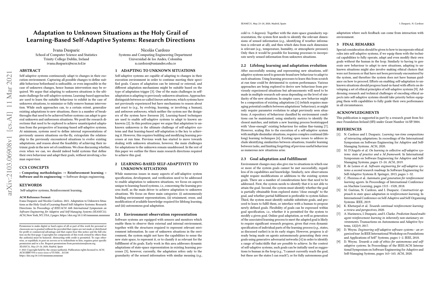 Self-adaptive systems continuously adapt to changes in their execution environment. Capturing all possible changes to define suitable behaviour beforehand is unfeasible, or even impossible in the case of unknown changes, hence human intervention may be required. We argue that adapting to unknown situations is the ultimate challenge for self-adaptive systems. Learning-based approaches are used to learn the suitable behaviour to exhibit in the case of unknown situations, to minimize or fully remove human intervention. While such approaches can, to a certain extent, generalize existing adaptations to new situations, there is a number of breakthroughs that need to be achieved before systems can adapt to general unknown and unforeseen situations. We posit the research directions that need to be explored to achieve unanticipated adaptation from the perspective of learning-based self-adaptive systems. At minimum, systems need to define internal representations of previously unseen situations on-the-fly, extrapolate the relationship to the previously encountered situations to evolve existing adaptations, and reason about the feasibility of achieving their intrinsic goals in the new set of conditions. We close discussing whether, even when we can, we should indeed build systems that define their own behaviour and adapt their goals, without involving a human supervisor.