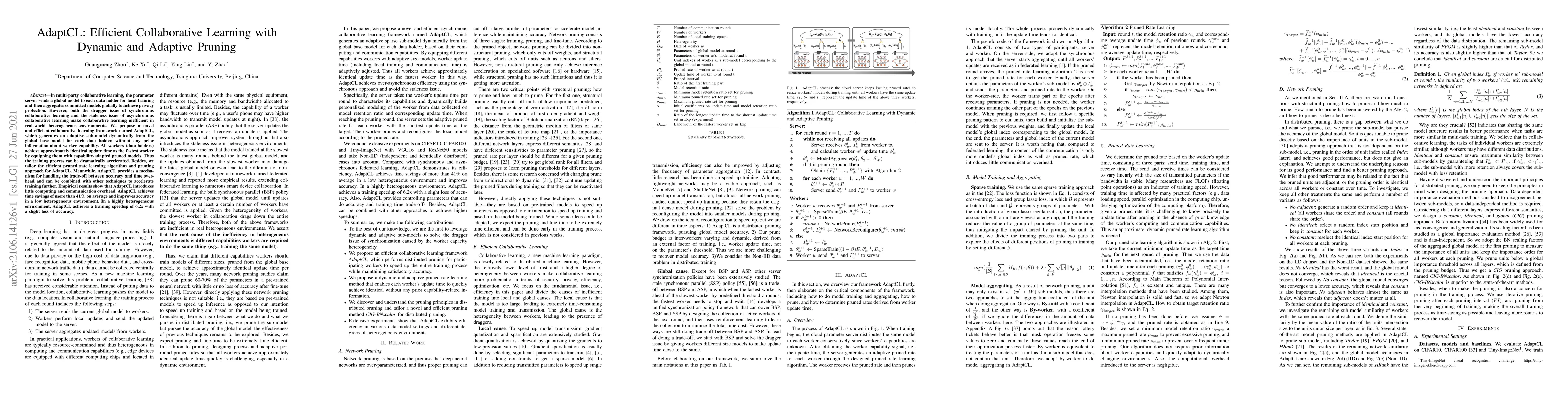 In multi-party collaborative learning, the parameter server sends a global model to each data holder for local training and then aggregates committed models globally to achieve privacy protection. However, both the dragger issue of synchronous collaborative learning and the staleness issue of asynchronous collaborative learning make collaborative learning inefficient in real-world heterogeneous environments. We propose a novel and efficient collaborative learning framework named AdaptCL, which generates an adaptive sub-model dynamically from the global base model for each data holder, without any prior information about worker capability. All workers (data holders) achieve approximately identical update time as the fastest worker by equipping them with capability-adapted pruned models. Thus the training process can be dramatically accelerated. Besides, we tailor the efficient pruned rate learning algorithm and pruning approach for AdaptCL. Meanwhile, AdaptCL provides a mechanism for handling the trade-off between accuracy and time overhead and can be combined with other techniques to accelerate training further. Empirical results show that AdaptCL introduces little computing and communication overhead. AdaptCL achieves time savings of more than 41\% on average and improves accuracy in a low heterogeneous environment. In a highly heterogeneous environment, AdaptCL achieves a training speedup of 6.2x with a slight loss of accuracy.