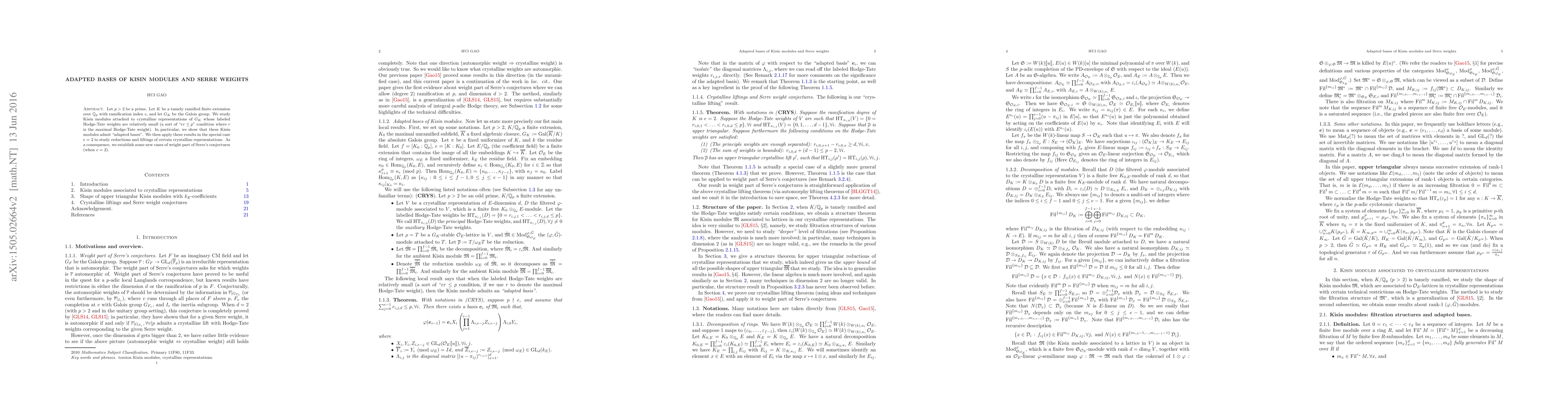 Let $p>2$ be a prime. Let $K$ be a tamely ramified finite extension over $\mathbb Q_p$ with ramification index $e$, and let $G_K$ be the Galois group. We study Kisin modules attached to crystalline representations of $G_K$ whose labeled Hodge-Tate weights are relatively small (a sort of "$er\le p$" condition where $r$ is the maximal Hodge-Tate weight). In particular, we show that these Kisin modules admit "adapted bases". We then apply these results in the special case $e=2$ to study reductions and liftings of certain crystalline representations. As a consequence, we establish some new cases of weight part of Serre's conjectures (when $e=2$).
