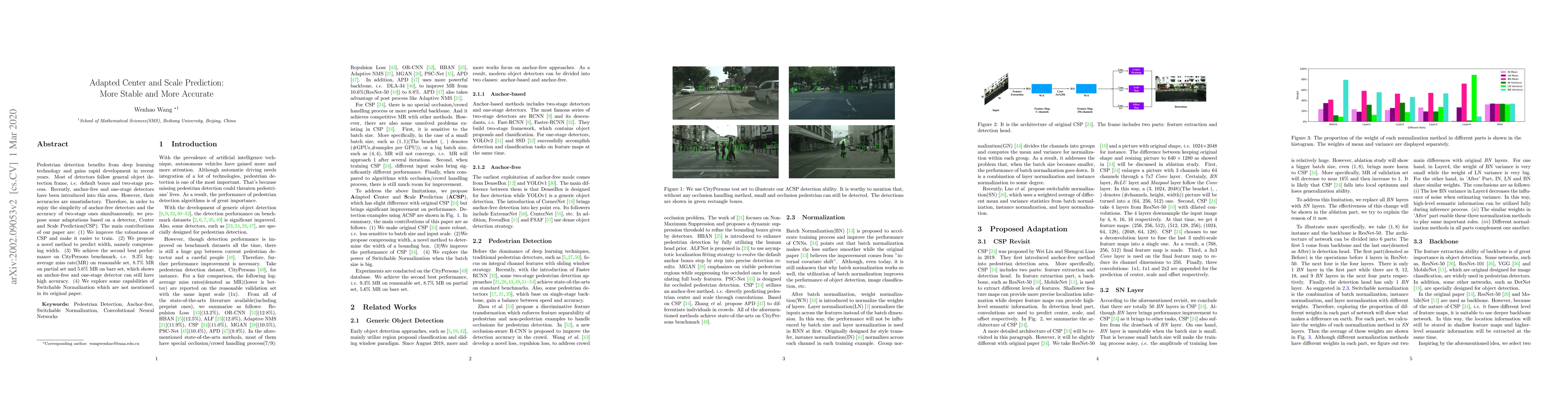 Pedestrian detection benefits from deep learning technology and gains rapid development in recent years. Most of detectors follow general object detection frame, i.e. default boxes and two-stage process. Recently, anchor-free and one-stage detectors have been introduced into this area. However, their accuracies are unsatisfactory. Therefore, in order to enjoy the simplicity of anchor-free detectors and the accuracy of two-stage ones simultaneously, we propose some adaptations based on a detector, Center and Scale Prediction(CSP). The main contributions of our paper are: (1) We improve the robustness of CSP and make it easier to train. (2) We propose a novel method to predict width, namely compressing width. (3) We achieve the second best performance on CityPersons benchmark, i.e. 9.3% log-average miss rate(MR) on reasonable set, 8.7% MR on partial set and 5.6% MR on bare set, which shows an anchor-free and one-stage detector can still have high accuracy. (4) We explore some capabilities of Switchable Normalization which are not mentioned in its original paper.