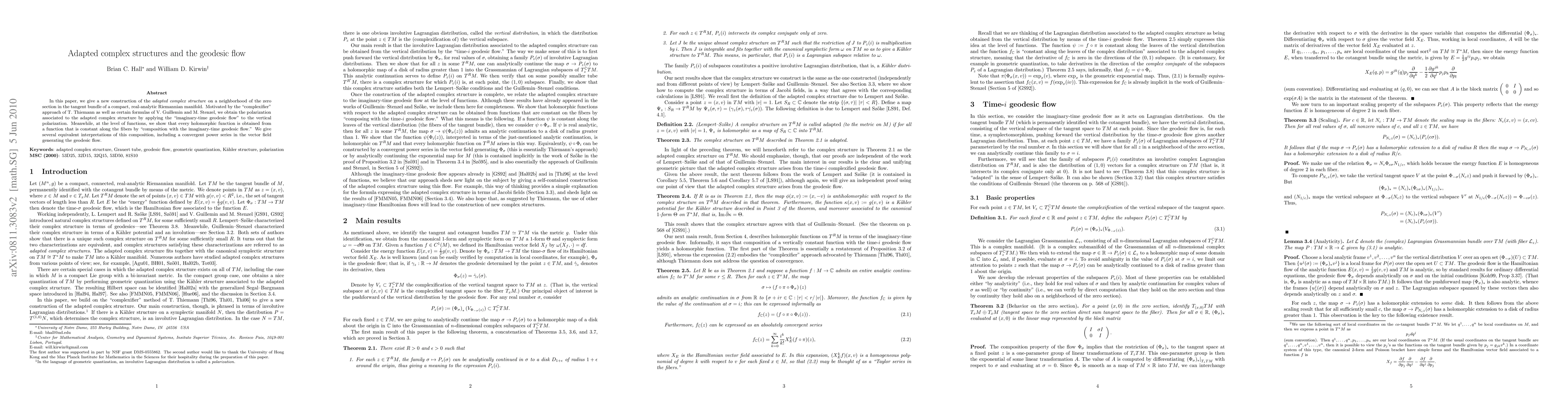 In this paper, we give a new construction of the adapted complex structure on a neighborhood of the zero section in the tangent bundle of a compact, real-analytic Riemannian manifold. Motivated by the "complexifier" approach of T. Thiemann as well as certain formulas of V. Guillemin and M. Stenzel, we obtain the polarization associated to the adapted complex structure by applying the "imaginary-time geodesic flow" to the vertical polarization. Meanwhile, at the level of functions, we show that every holomorphic function is obtained from a function that is constant along the fibers by "composition with the imaginary-time geodesic flow." We give several equivalent interpretations of this composition, including a convergent power series in the vector field generating the geodesic flow.