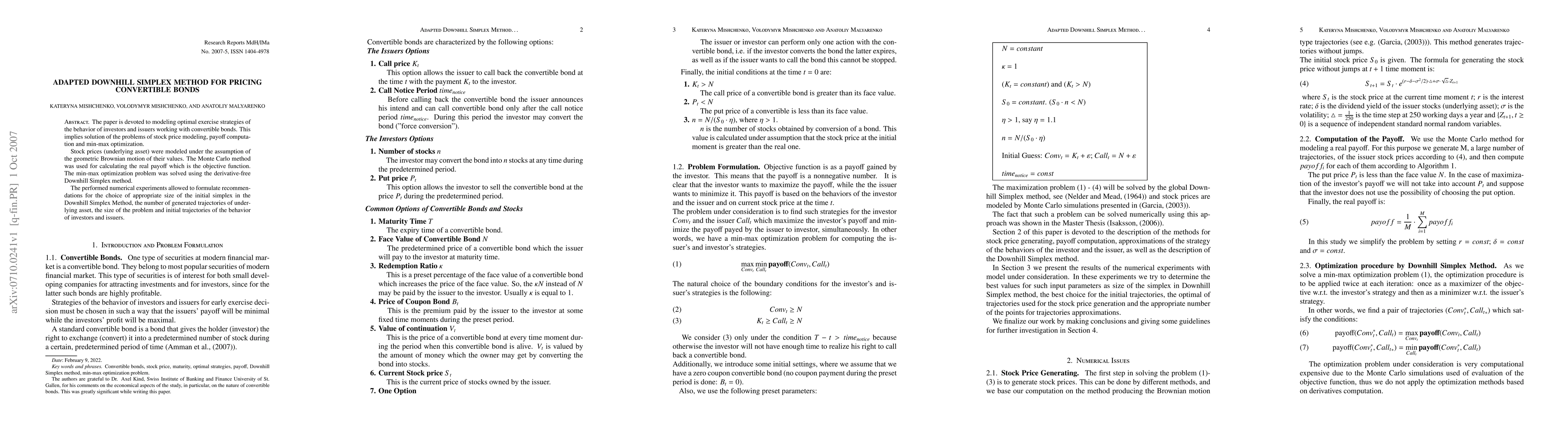 This paper models optimal exercise strategies for convertible bonds using geometric Brownian motion for stock prices and the Monte Carlo method for payoff computation. It employs the Downhill Simplex method for solving min-max optimization problems, and numerical experiments provide guidelines for method parameters.
