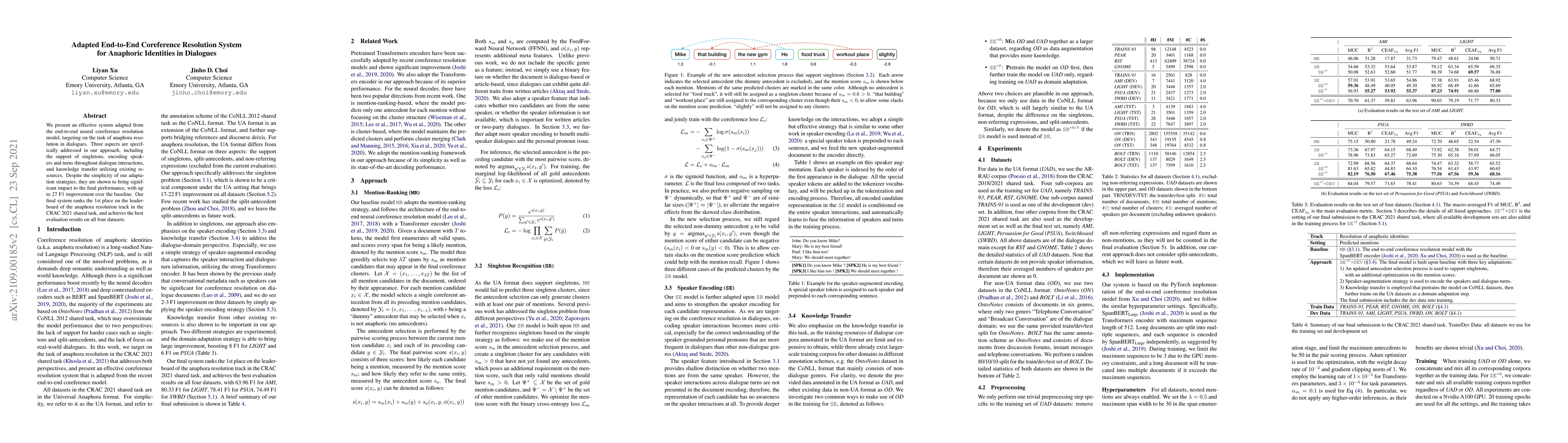 This research introduces an adapted end-to-end neural coreference resolution system for resolving anaphora in dialogues, addressing singletons, speaker and turn encoding, and knowledge transfer. The system achieves a 27 F1 score improvement over the baseline and ranks first in the CRAC 2021 shared task anaphora resolution track.