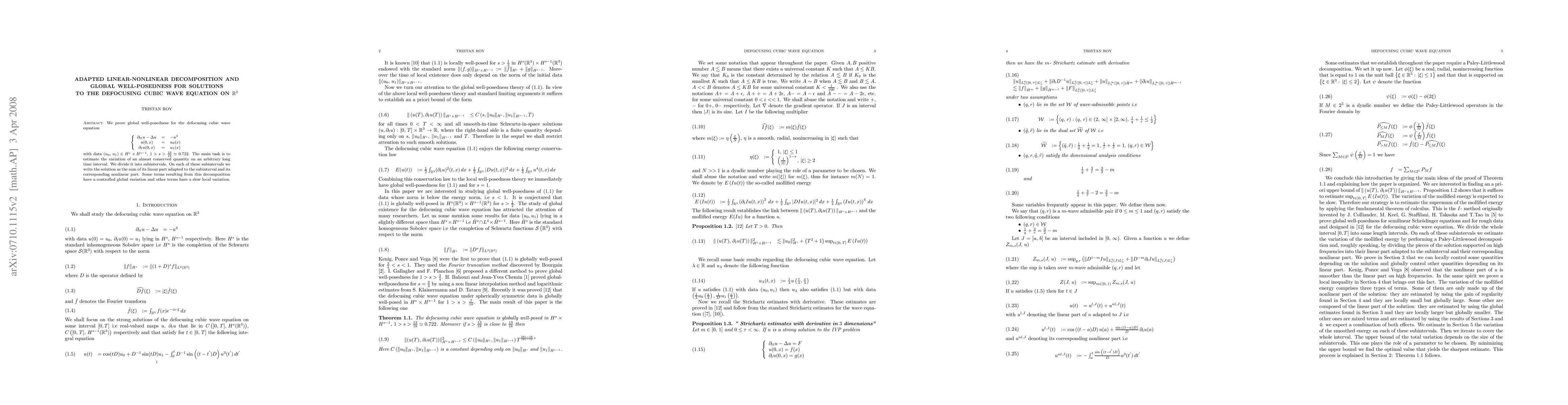 We prove global well-posedness for the defocusing cubic wave equation with data in $H^{s} \times H^{s-1}$, $1>s>{13/18}$. The main task is to estimate the variation of an almost conserved quantity on an arbitrary long time interval. We divide it into subintervals. On each of these subintervals we write the solution as the sum of its linear part adapted to the subinterval and its corresponding npnlinear part. Some terms resulting from this decomposition have a controlled global variation and other terms have a slow local variation.
