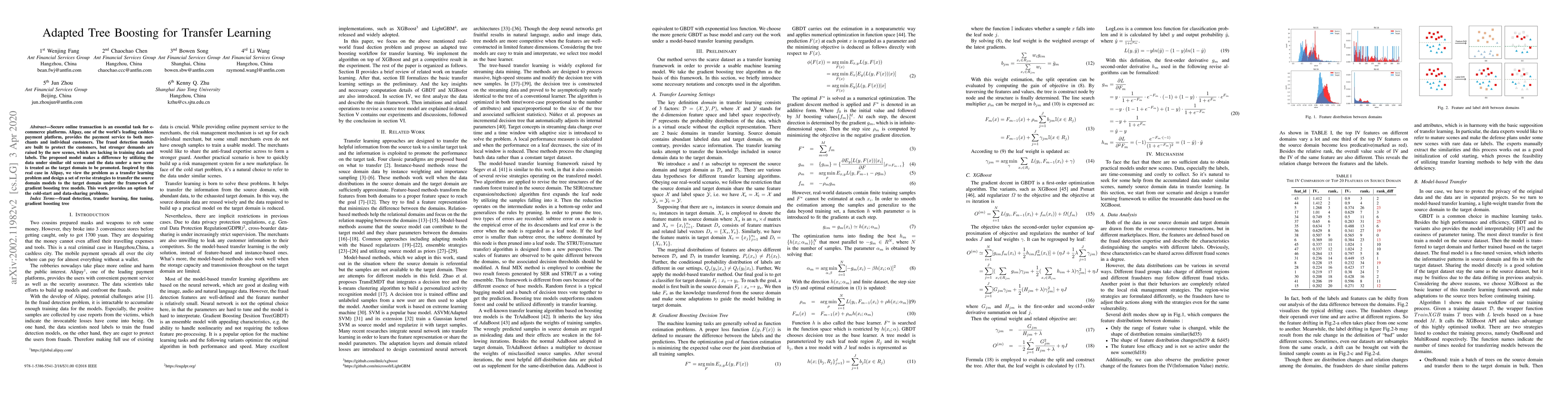 Secure online transaction is an essential task for e-commerce platforms. Alipay, one of the world's leading cashless payment platform, provides the payment service to both merchants and individual customers. The fraud detection models are built to protect the customers, but stronger demands are raised by the new scenes, which are lacking in training data and labels. The proposed model makes a difference by utilizing the data under similar old scenes and the data under a new scene is treated as the target domain to be promoted. Inspired by this real case in Alipay, we view the problem as a transfer learning problem and design a set of revise strategies to transfer the source domain models to the target domain under the framework of gradient boosting tree models. This work provides an option for the cold-starting and data-sharing problems.