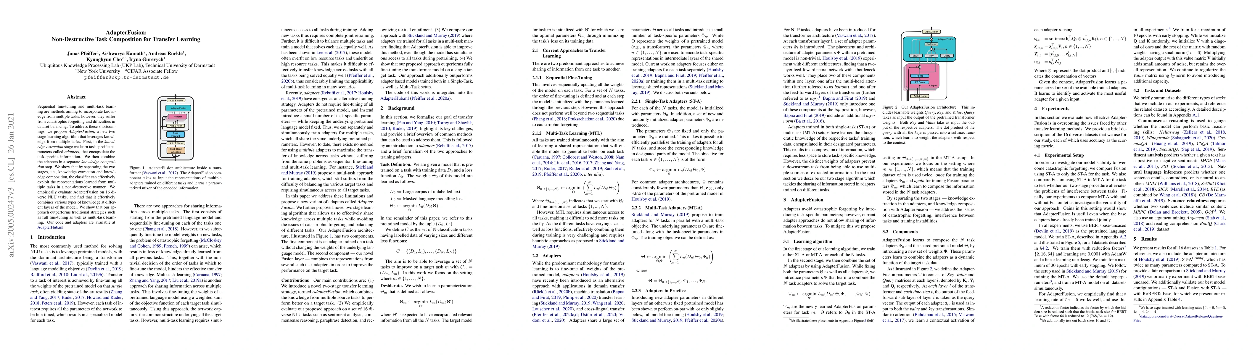 AdapterFusion introduces a two-stage learning algorithm to mitigate catastrophic forgetting and dataset balancing issues in transfer learning. It extracts task-specific knowledge through adapters and combines them separately, achieving better performance than full fine-tuning and multi-task learning across 16 diverse NLU tasks.
