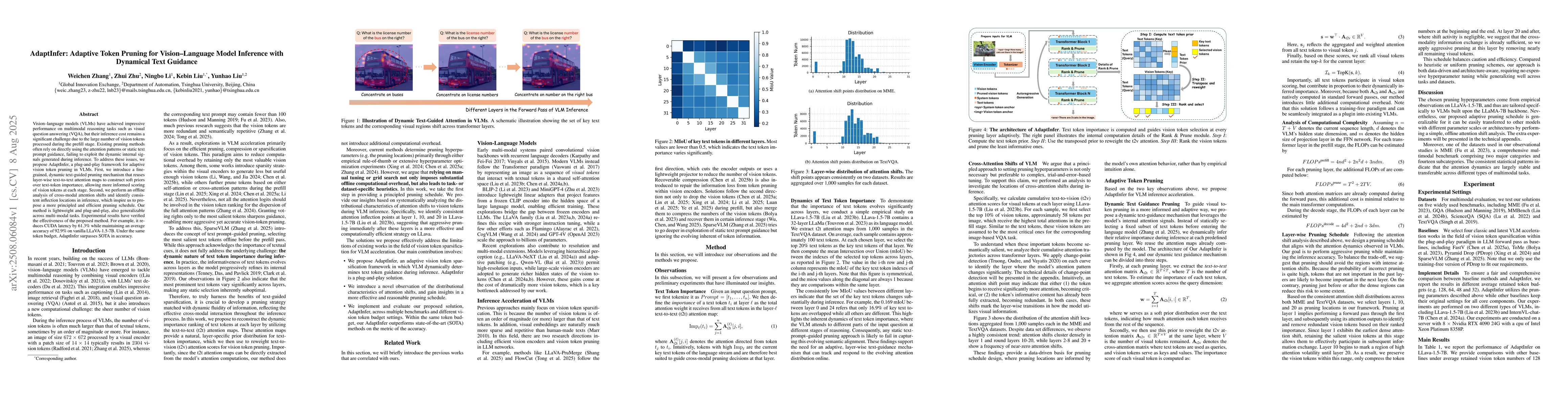 Vision-language models (VLMs) have achieved impressive performance on multimodal reasoning tasks such as visual question answering (VQA), but their inference cost remains a significant challenge due to the large number of vision tokens processed during the prefill stage. Existing pruning methods often rely on directly using the attention patterns or static text prompt guidance, failing to exploit the dynamic internal signals generated during inference. To address these issues, we propose AdaptInfer, a plug-and-play framework for adaptive vision token pruning in VLMs. First, we introduce a fine-grained, dynamic text-guided pruning mechanism that reuses layer-wise text-to-text attention maps to construct soft priors over text-token importance, allowing more informed scoring of vision tokens at each stage. Second, we perform an offline analysis of cross-modal attention shifts and identify consistent inflection locations in inference, which inspire us to propose a more principled and efficient pruning schedule. Our method is lightweight and plug-and-play, also generalizable across multi-modal tasks. Experimental results have verified the effectiveness of the proposed method. For example, it reduces CUDA latency by 61.3\% while maintaining an average accuracy of 92.9\% on vanilla LLaVA-1.5-7B. Under the same token budget, AdaptInfer surpasses SOTA in accuracy.