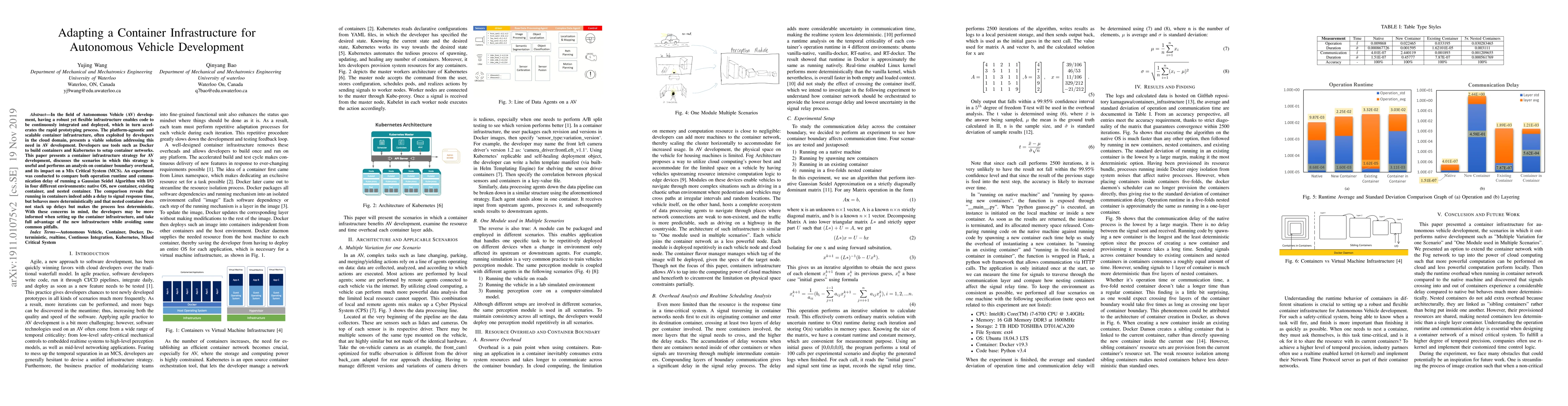 This paper proposes a container infrastructure strategy for autonomous vehicle development, leveraging Docker and Kubernetes to facilitate continuous integration and deployment. Experimental results show that while containers introduce some communication delay, they offer more deterministic behavior, with nested containers providing less predictable performance.