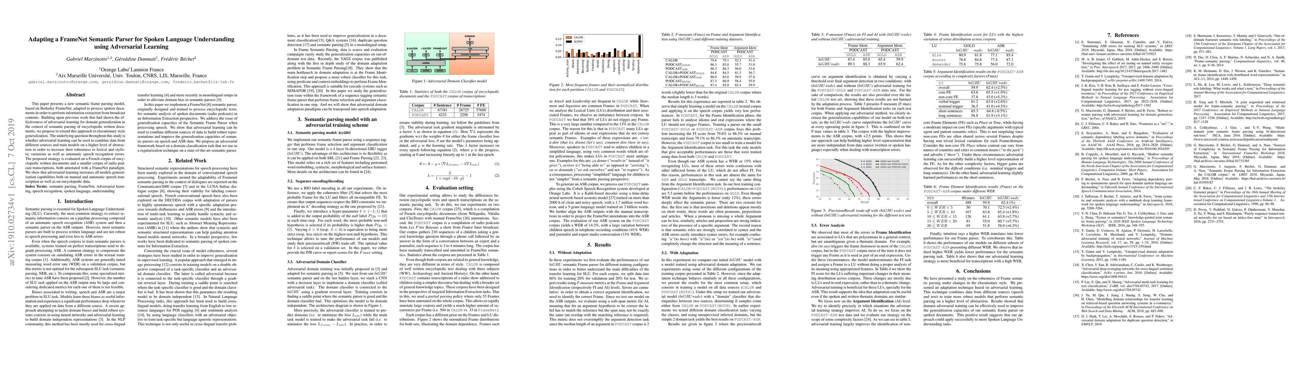 This paper presents a new semantic frame parsing model, based on Berkeley FrameNet, adapted to process spoken documents in order to perform information extraction from broadcast contents. Building upon previous work that had shown the effectiveness of adversarial learning for domain generalization in the context of semantic parsing of encyclopedic written documents, we propose to extend this approach to elocutionary style generalization. The underlying question throughout this study is whether adversarial learning can be used to combine data from different sources and train models on a higher level of abstraction in order to increase their robustness to lexical and stylistic variations as well as automatic speech recognition errors. The proposed strategy is evaluated on a French corpus of encyclopedic written documents and a smaller corpus of radio podcast transcriptions, both annotated with a FrameNet paradigm. We show that adversarial learning increases all models generalization capabilities both on manual and automatic speech transcription as well as on encyclopedic data.