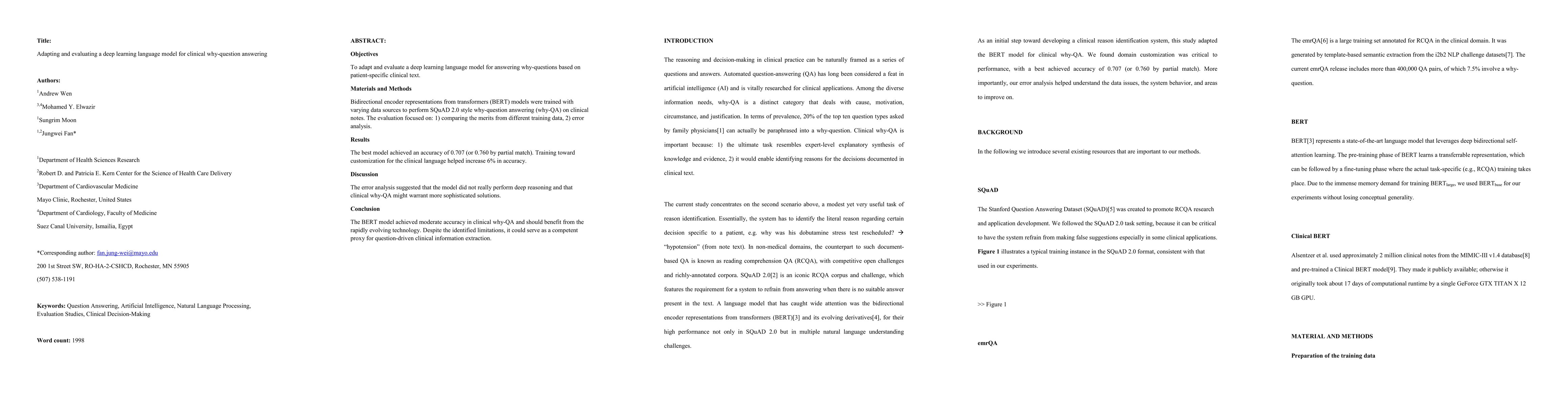 This paper adapts a BERT model for answering why-questions from clinical notes, achieving moderate accuracy. The study highlights the need for more sophisticated approaches for deep reasoning in clinical why-question answering.