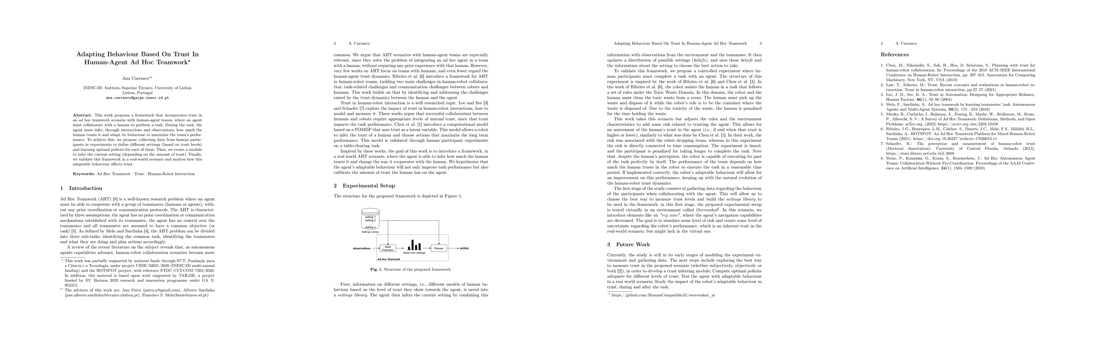 This work proposes a framework that incorporates trust in an ad hoc teamwork scenario with human-agent teams, where an agent must collaborate with a human to perform a task. During the task, the agent must infer, through interactions and observations, how much the human trusts it and adapt its behaviour to maximize the team's performance. To achieve this, we propose collecting data from human participants in experiments to define different settings (based on trust levels) and learning optimal policies for each of them. Then, we create a module to infer the current setting (depending on the amount of trust). Finally, we validate this framework in a real-world scenario and analyse how this adaptable behaviour affects trust.