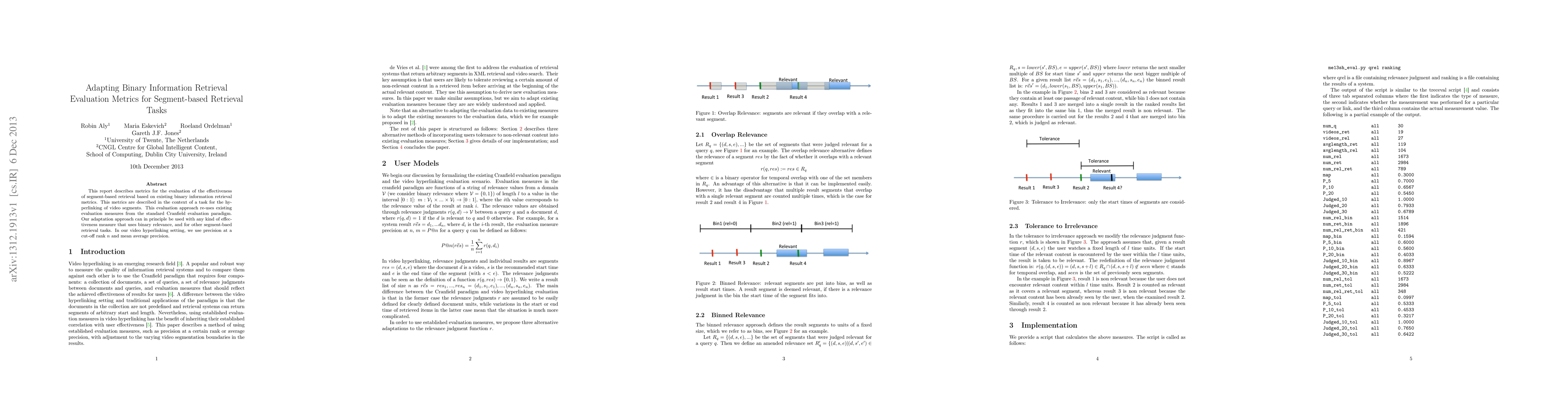 This paper adapts traditional binary information retrieval metrics for segment-based retrieval tasks, specifically for video segment hyperlinking. It employs precision at a cut-off rank and mean average precision, extending the Cranfield evaluation paradigm to new contexts.
