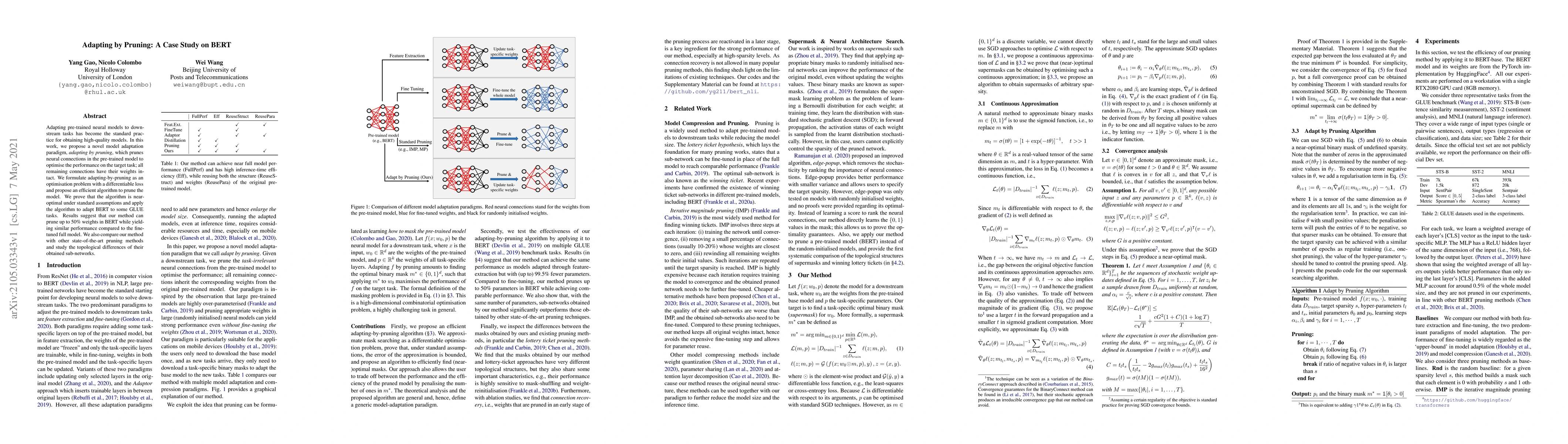 Adapting pre-trained neural models to downstream tasks has become the standard practice for obtaining high-quality models. In this work, we propose a novel model adaptation paradigm, adapting by pruning, which prunes neural connections in the pre-trained model to optimise the performance on the target task; all remaining connections have their weights intact. We formulate adapting-by-pruning as an optimisation problem with a differentiable loss and propose an efficient algorithm to prune the model. We prove that the algorithm is near-optimal under standard assumptions and apply the algorithm to adapt BERT to some GLUE tasks. Results suggest that our method can prune up to 50% weights in BERT while yielding similar performance compared to the fine-tuned full model. We also compare our method with other state-of-the-art pruning methods and study the topological differences of their obtained sub-networks.
