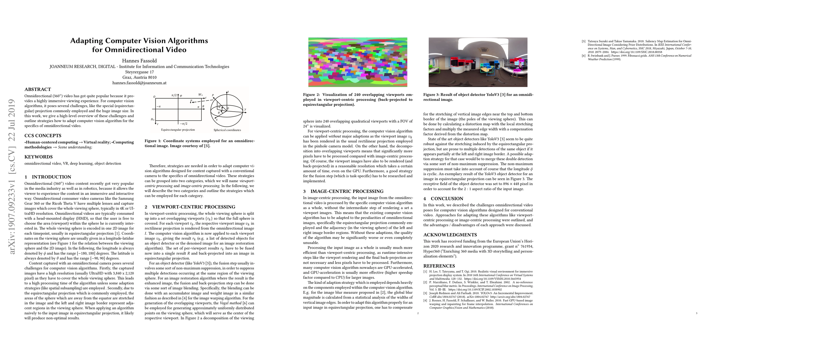 This paper discusses the challenges of applying computer vision algorithms to omnidirectional (360°) video, including the unique equirectangular projection and large image size, and proposes strategies to adapt existing algorithms for these specific characteristics.