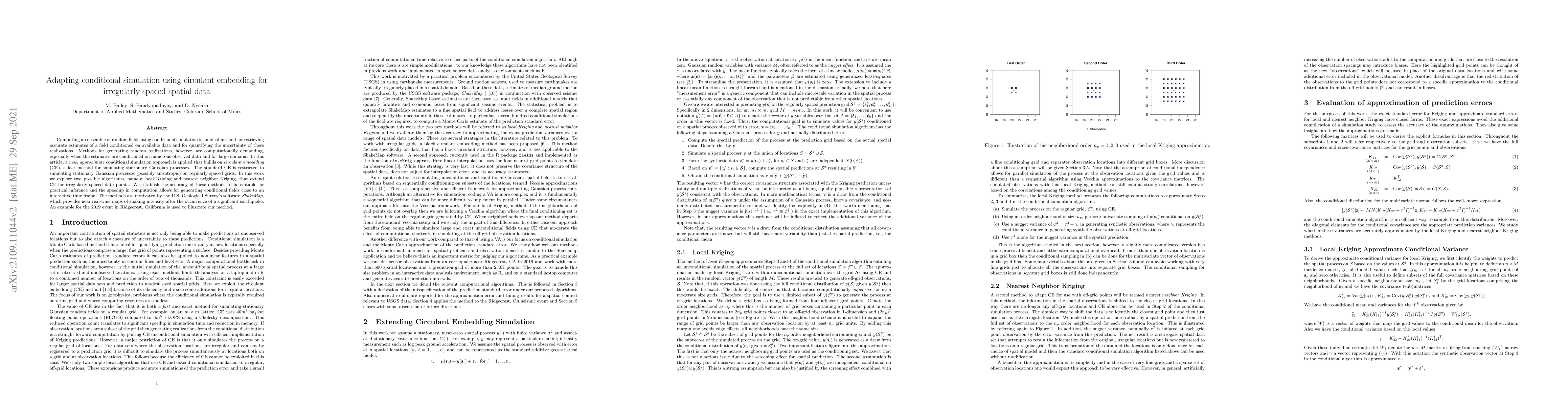 This paper proposes a new approximate conditional simulation method using circulant embedding for generating random fields conditioned on irregularly spaced spatial data. The approach extends circulant embedding to handle such data, enabling faster computation and practical inference, demonstrated through an application to the U.S. Geological Survey's ShakeMap software.