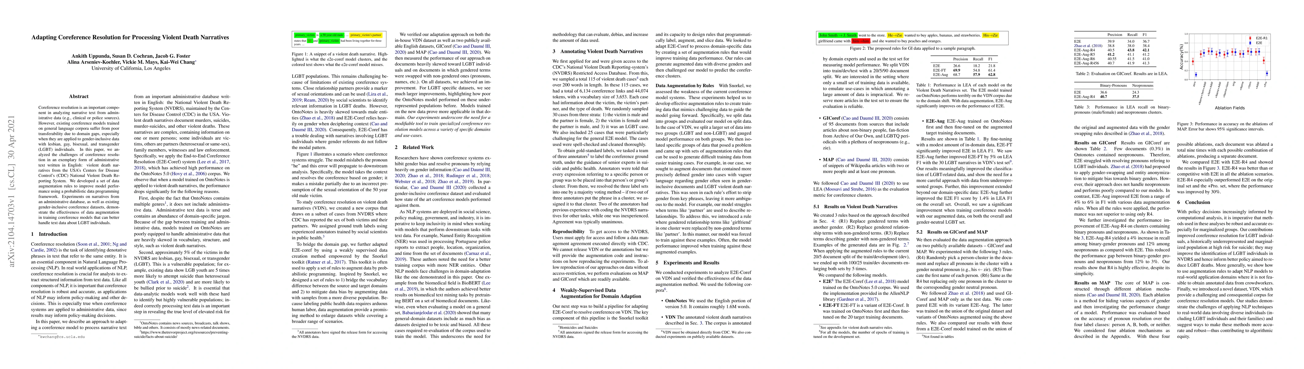 This paper addresses the challenges of coreference resolution in violent death narratives from the CDC's National Violent Death Reporting System, developing data augmentation rules to improve model performance for gender-inclusive language. Experiments show enhanced model effectiveness for texts involving LGBT individuals.