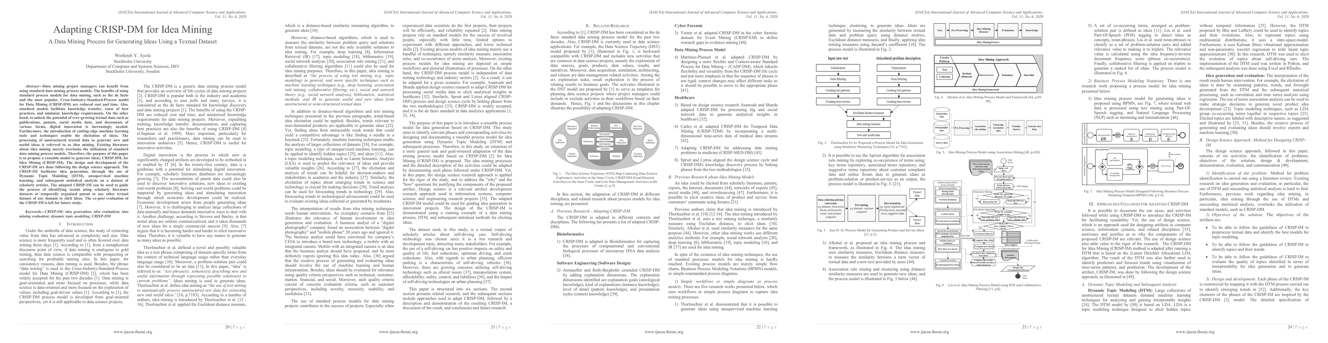 This paper proposes an adapted version of the CRISP-DM model, called CRISP-IM, for idea mining using textual datasets. The CRISP-IM integrates Dynamic Topic Modeling and statistical analysis to generate ideas from scholarly articles, aiming to facilitate knowledge transfer and idea elicitation from unstructured textual data.