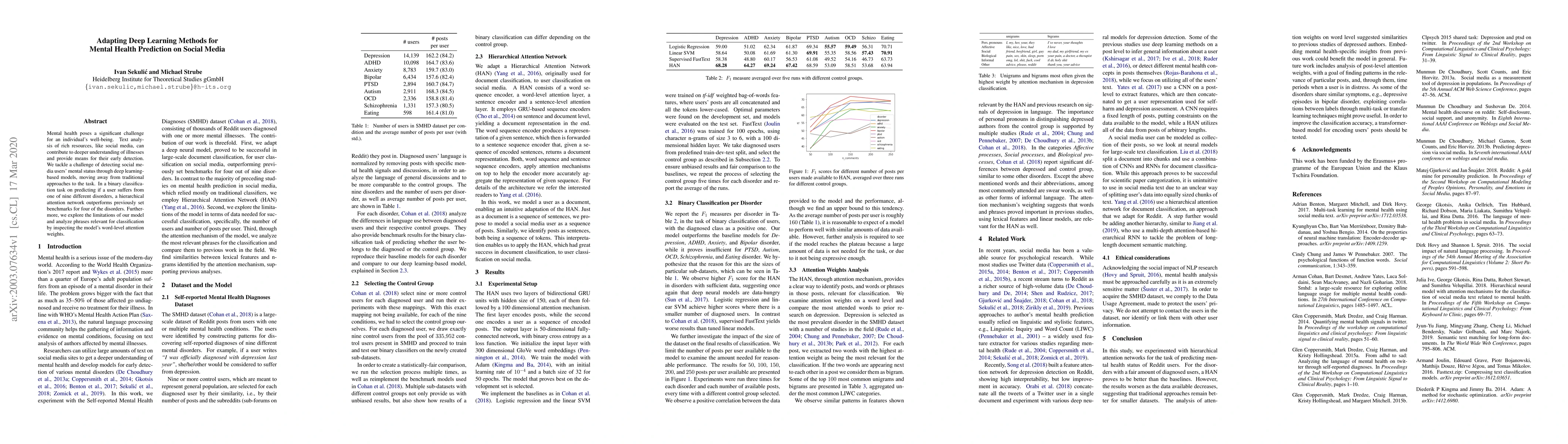 This paper explores deep learning methods for predicting mental health disorders from social media data, using a hierarchical attention network that outperforms traditional approaches for four out of nine disorders. The study also investigates the model's limitations and identifies key phrases for classification through word-level attention analysis.