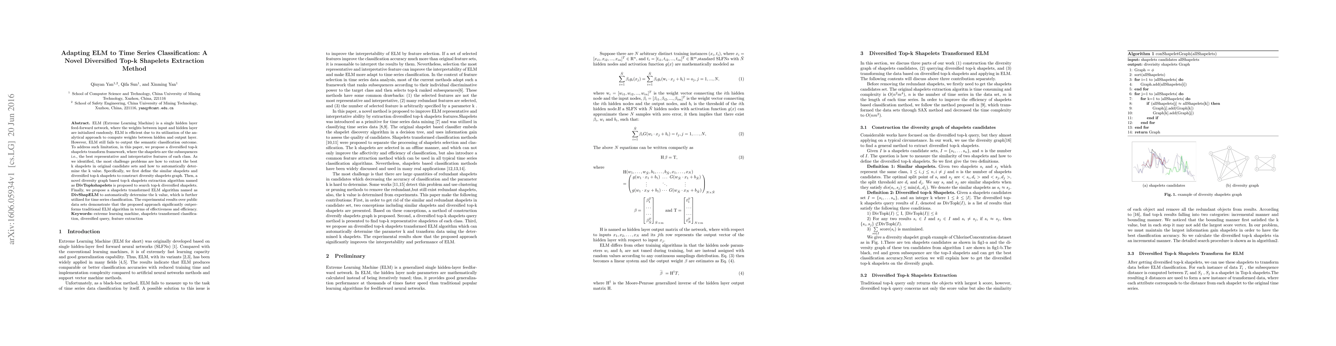 ELM (Extreme Learning Machine) is a single hidden layer feed-forward network, where the weights between input and hidden layer are initialized randomly. ELM is efficient due to its utilization of the analytical approach to compute weights between hidden and output layer. However, ELM still fails to output the semantic classification outcome. To address such limitation, in this paper, we propose a diversified top-k shapelets transform framework, where the shapelets are the subsequences i.e., the best representative and interpretative features of each class. As we identified, the most challenge problems are how to extract the best k shapelets in original candidate sets and how to automatically determine the k value. Specifically, we first define the similar shapelets and diversified top-k shapelets to construct diversity shapelets graph. Then, a novel diversity graph based top-k shapelets extraction algorithm named as \textbf{DivTopkshapelets}\ is proposed to search top-k diversified shapelets. Finally, we propose a shapelets transformed ELM algorithm named as \textbf{DivShapELM} to automatically determine the k value, which is further utilized for time series classification. The experimental results over public data sets demonstrate that the proposed approach significantly outperforms traditional ELM algorithm in terms of effectiveness and efficiency.