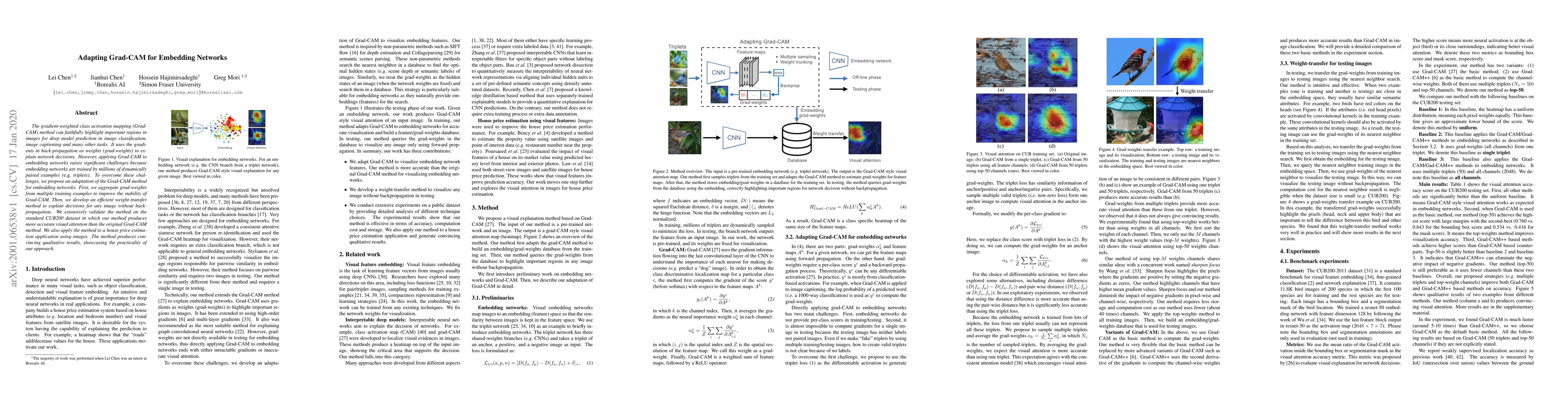 This paper proposes an adaptation of Grad-CAM for embedding networks to address challenges in applying the method to networks trained with dynamically paired examples. The adapted method aggregates grad-weights and uses a weight-transfer technique for efficient explanation without back-propagation, demonstrating improved accuracy on the CUB200 dataset and practical application in house price estimation.