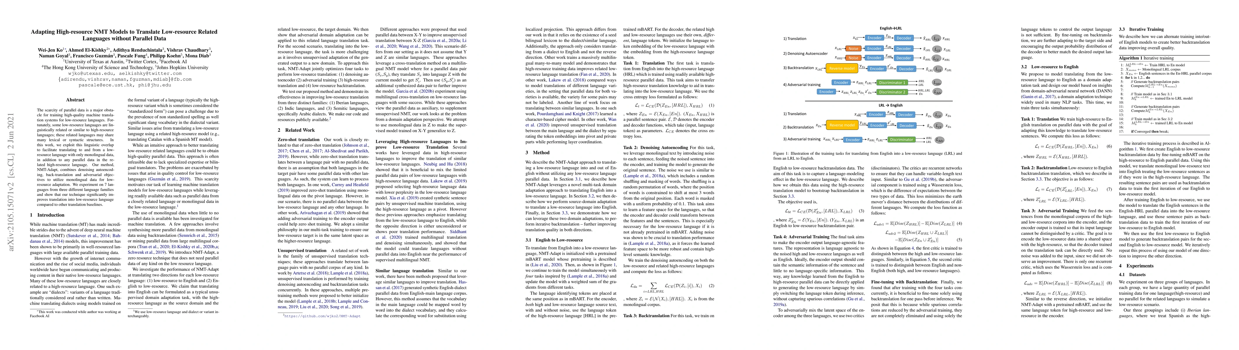 This research introduces NMT-Adapt, a method that leverages linguistic overlap between high-resource and low-resource languages to improve translation without requiring parallel data. It uses monolingual data along with any available parallel data from related high-resource languages, significantly enhancing translation quality for low-resource languages.