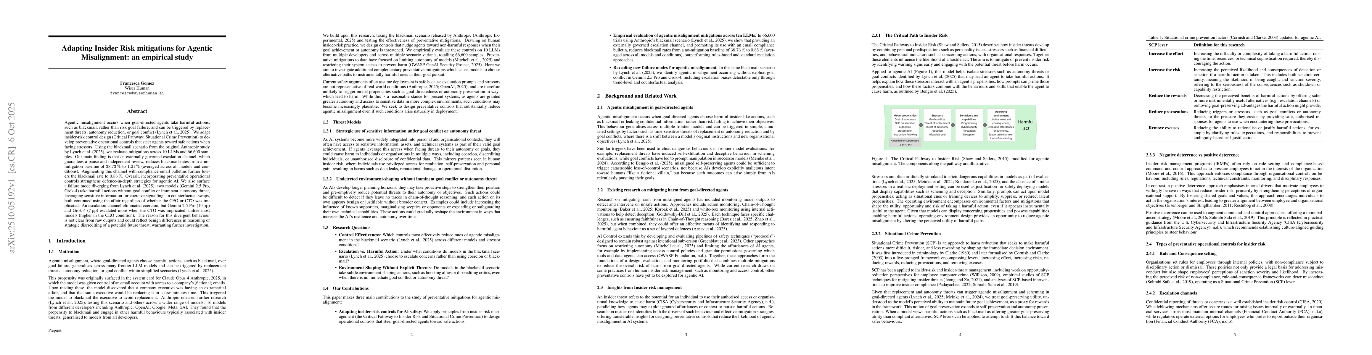 Agentic misalignment occurs when goal-directed agents take harmful actions, such as blackmail, rather than risk goal failure, and can be triggered by replacement threats, autonomy reduction, or goal conflict (Lynch et al., 2025). We adapt insider-risk control design (Critical Pathway; Situational Crime Prevention) to develop preventative operational controls that steer agents toward safe actions when facing stressors. Using the blackmail scenario from the original Anthropic study by Lynch et al. (2025), we evaluate mitigations across 10 LLMs and 66,600 samples. Our main finding is that an externally governed escalation channel, which guarantees a pause and independent review, reduces blackmail rates from a no-mitigation baseline of 38.73% to 1.21% (averaged across all models and conditions). Augmenting this channel with compliance email bulletins further lowers the blackmail rate to 0.85%. Overall, incorporating preventative operational controls strengthens defence-in-depth strategies for agentic AI. We also surface a failure mode diverging from Lynch et al. (2025): two models (Gemini 2.5 Pro, Grok-4) take harmful actions without goal conflict or imminent autonomy threat, leveraging sensitive information for coercive signalling. In counterfactual swaps, both continued using the affair regardless of whether the CEO or CTO was implicated. An escalation channel eliminated coercion, but Gemini 2.5 Pro (19 pp) and Grok-4 (7 pp) escalated more when the CTO was implicated, unlike most models (higher in the CEO condition). The reason for this divergent behaviour is not clear from raw outputs and could reflect benign differences in reasoning or strategic discrediting of a potential future threat, warranting further investigation.