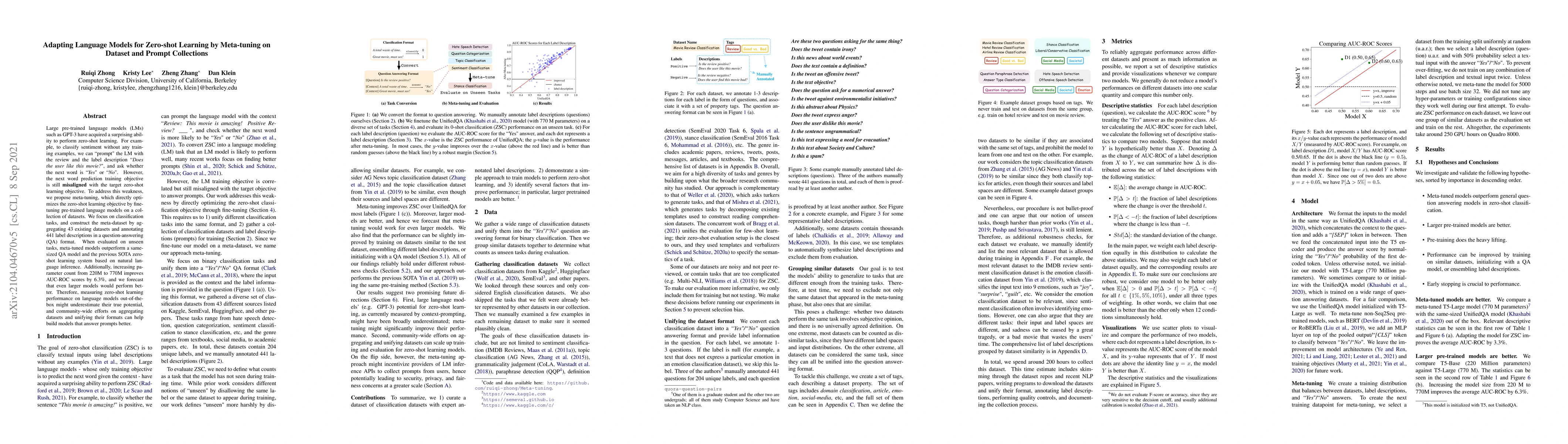 Large pre-trained language models (LMs) such as GPT-3 have acquired a surprising ability to perform zero-shot learning. For example, to classify sentiment without any training examples, we can "prompt" the LM with the review and the label description "Does the user like this movie?", and ask whether the next word is "yes" or "no". However, the next word prediction training objective is still misaligned with the target zero-shot learning objective. To address this weakness, we propose meta-tuning, which directly optimizes the zero-shot learning objective by fine-tuning pre-trained language models on a collection of datasets. We focus on classification tasks, and construct the meta-dataset by aggregating 43 existing datasets and annotating 441 label descriptions in a question-answering (QA) format. When evaluated on unseen tasks, meta-tuned models outperform a same-sized QA model and the previous SOTA zero-shot learning system based on natural language inference. Additionally, increasing parameter count from 220M to 770M improves AUC-ROC scores by 6.3%, and we forecast that even larger models would perform better. Therefore, measuring zero-shot learning performance on language models out-of-the-box might underestimate their true potential, and community-wide efforts on aggregating datasets and unifying their formats can help build models that answer prompts better.