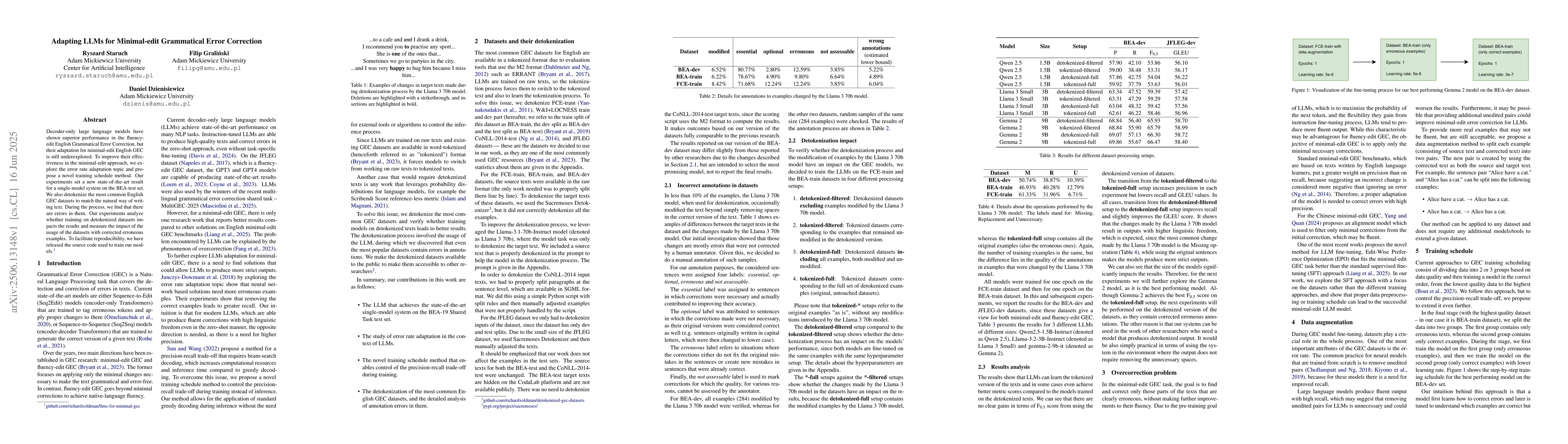 This research improves decoder-only large language models' performance in minimal-edit English Grammatical Error Correction (GEC) by proposing a novel training schedule method. The study sets a new state-of-the-art result on the BEA-test set, detokenizes common GEC datasets, identifies errors within them, and analyzes the impact of training on corrected examples. The authors have also released their source code for reproducibility.