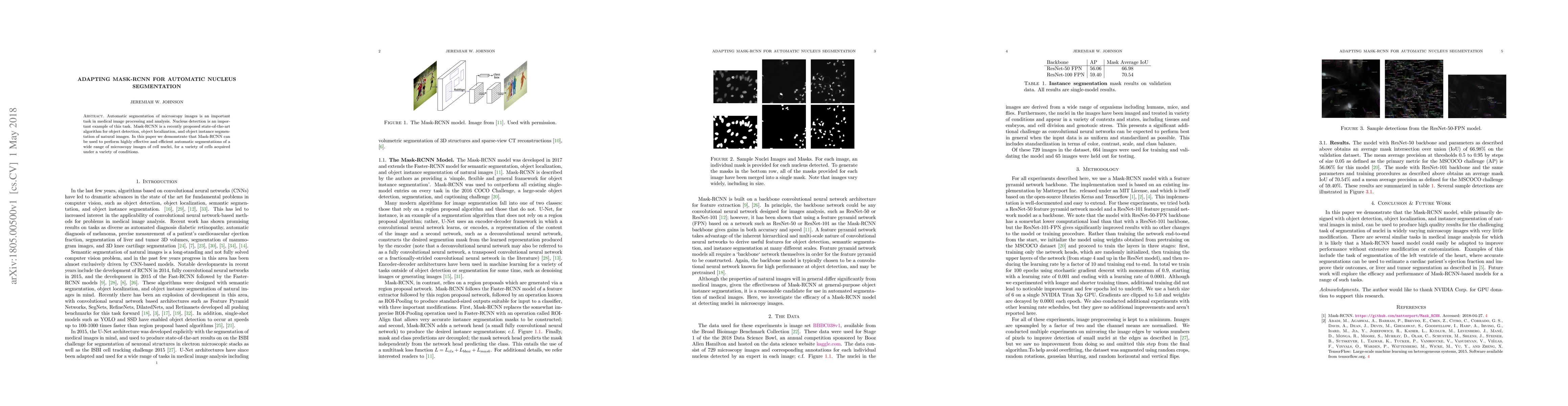 This paper adapts the Mask-RCNN algorithm for automatic segmentation of cell nuclei in microscopy images, demonstrating its effectiveness and efficiency across diverse cell types and conditions. The approach leverages Mask-RCNN's capabilities for object detection and instance segmentation to achieve precise nucleus segmentation.
