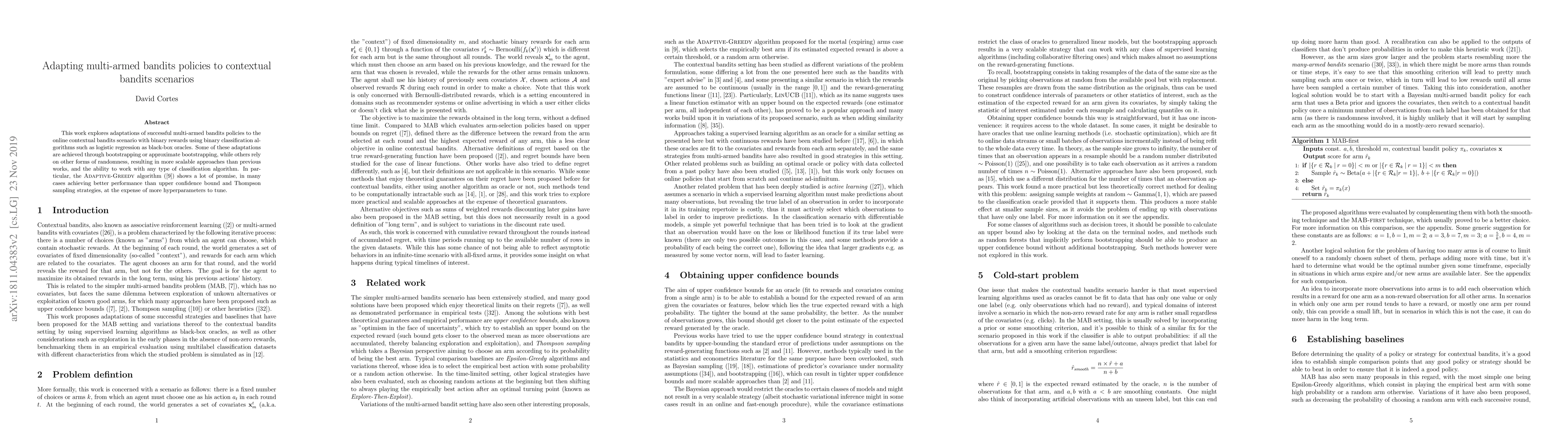 This paper investigates adapting multi-armed bandit strategies to contextual bandits with binary rewards, employing logistic regression as black-box oracles. The Adaptive-Greedy algorithm demonstrates superior performance compared to traditional methods like upper confidence bound and Thompson sampling, albeit with increased hyperparameter tuning complexity.